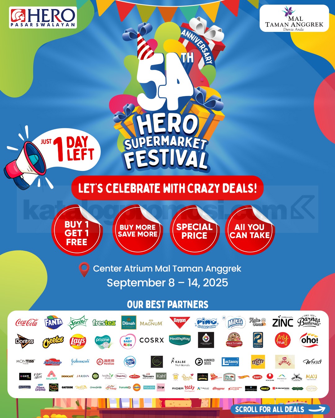 The wait is over! 🎉 54th HERO Supermarket Festival akhirnya hadir di Mal Taman Anggrek. Event besar ini berlangsung mulai 8–14 September 2025 di Center Atrium, siap menghadirkan promo heboh, acara seru, hingga aktivitas keluarga yang sayang kalau dilewatkan.