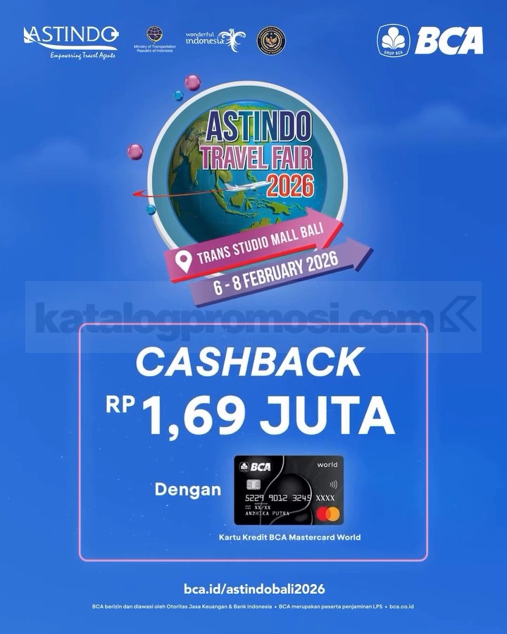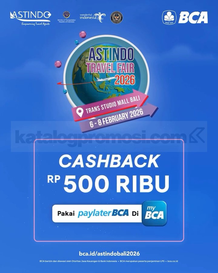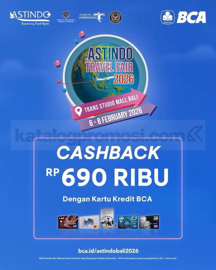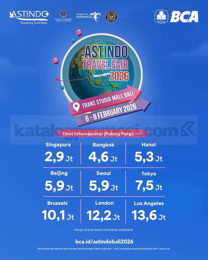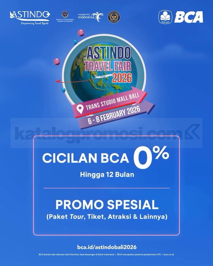 ASTINDO Travel Fair 2026 di Trans Studio Mall Bali dengan promo tiket perjalanan, paket wisata, dan penawaran khusus BCA, berlaku 6 – 8 Februari 2026.