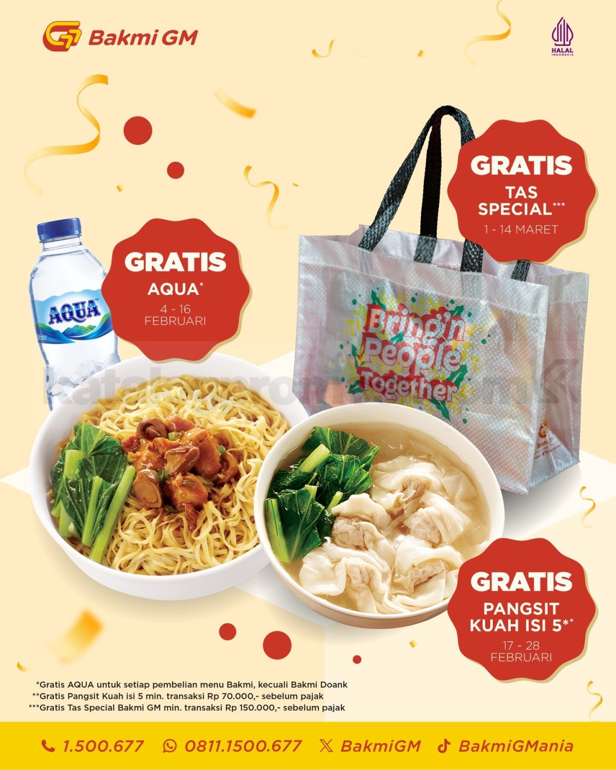 Nggak cuma soal menu, Promo Bakmi GM Grand Opening Green Terrace TMII juga makin menarik karena ada bonus tambahan untuk GMania. Mulai dari free AQUA di periode tertentu, free pangsit kuah isi 5 dengan minimum transaksi, sampai tas spesial Bakmi GM yang bisa kamu dapatkan selama promo berlangsung.
