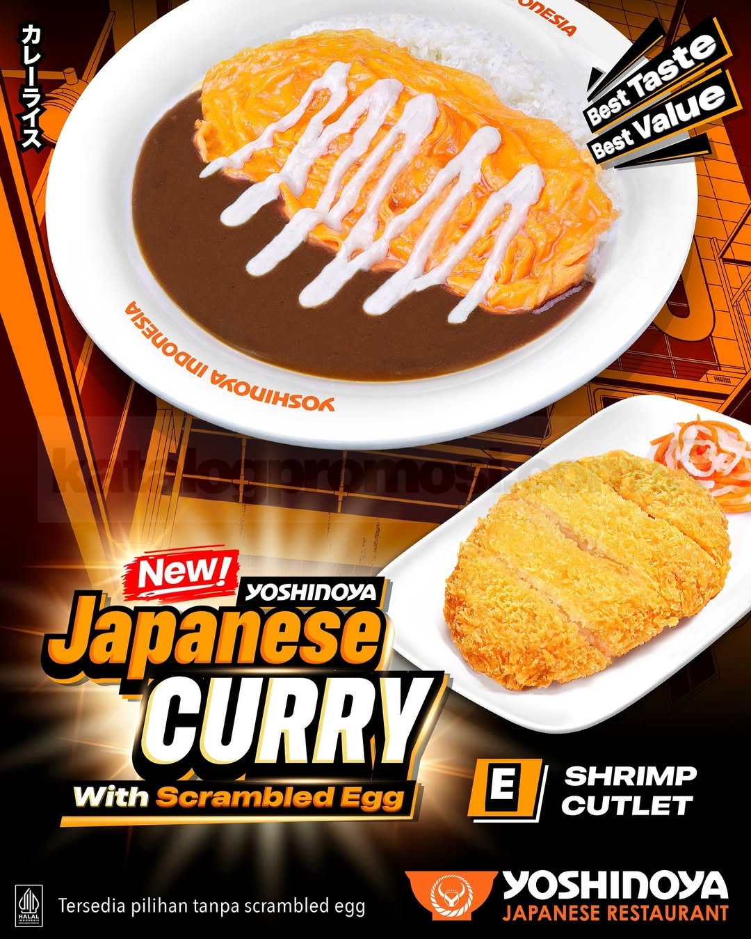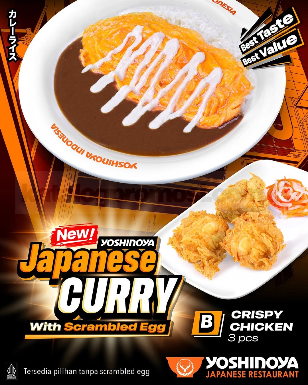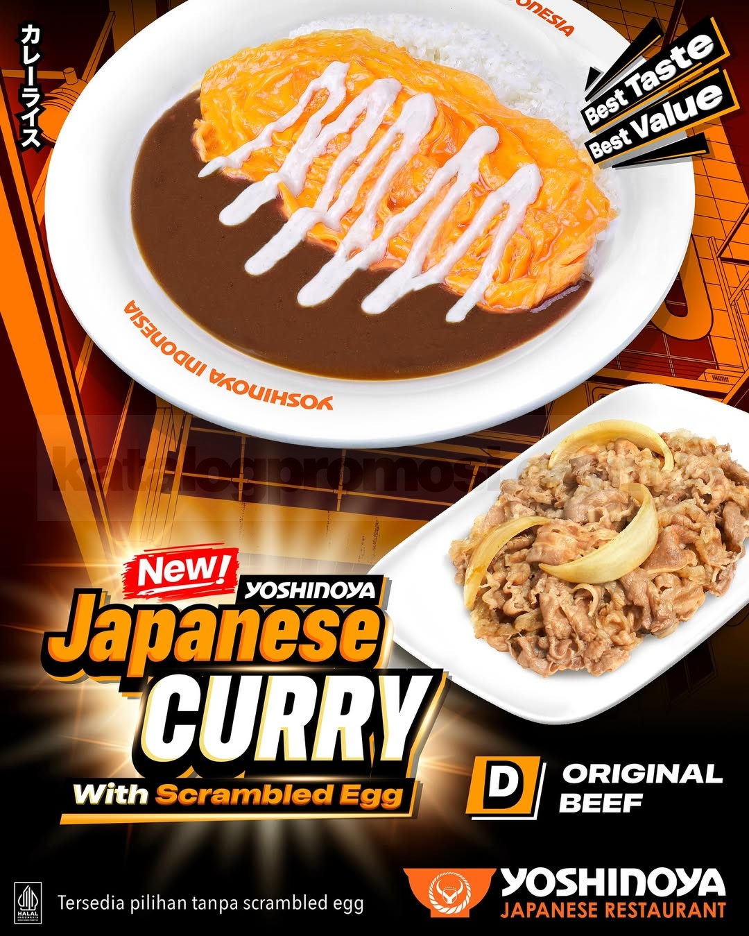 Menu Yoshinoya Japanese Curry Scrambled Egg ini tersedia di seluruh store Yoshinoya Indonesia. Bisa dine in, takeaway, delivery, atau order via GoFood, GrabFood, dan ShopeeFood. Best Taste, Best Value pokoknya 💯