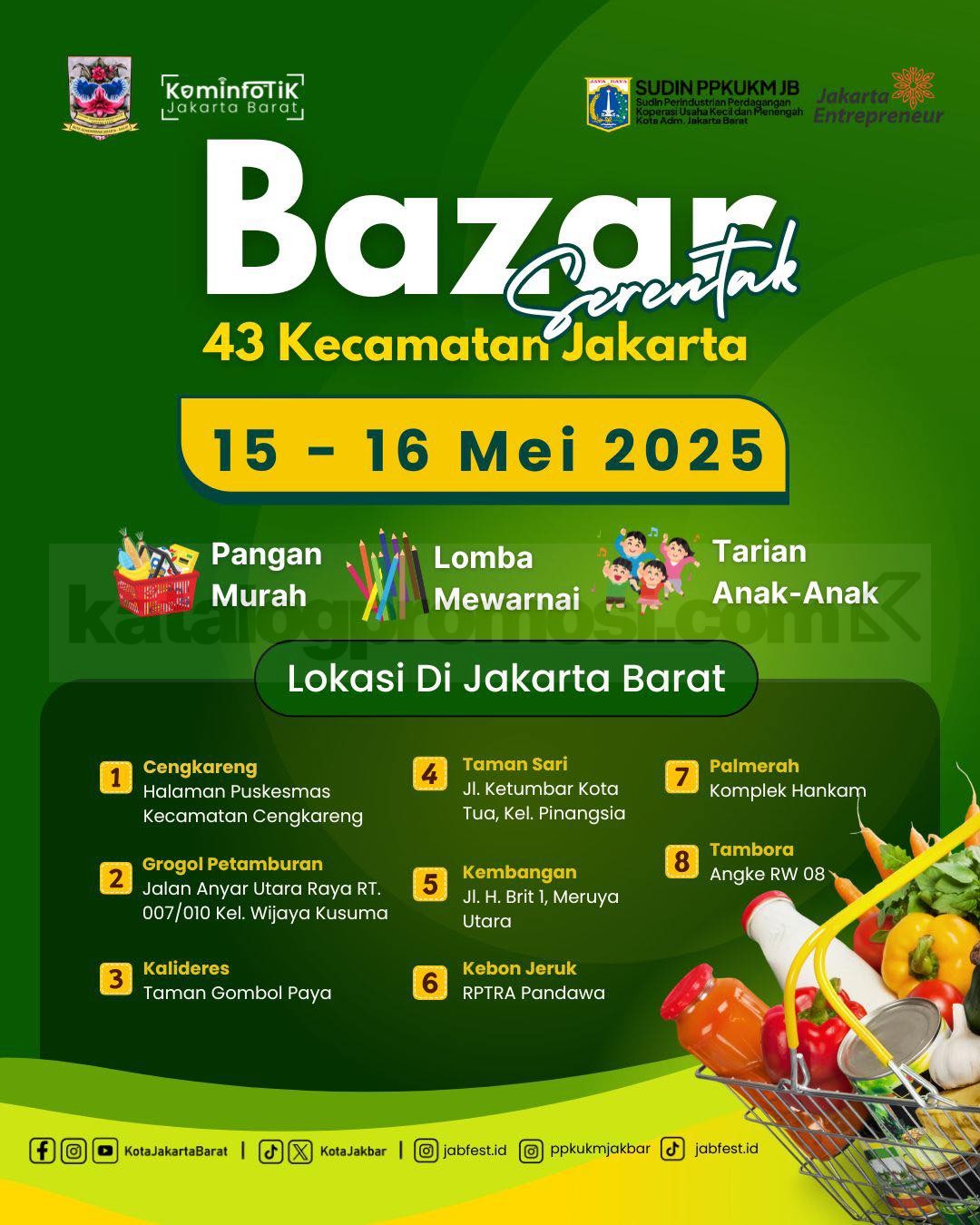 Dinas PPKUKM DKI Jakarta bakal gelar Bazar Serentak di 43 kecamatan, termasuk 8 titik di Jakarta Barat. Promo ini cuma berlangsung 2 hari, dari tanggal 15β16 Mei 2025, jadi jangan sampai kelewatan! π₯