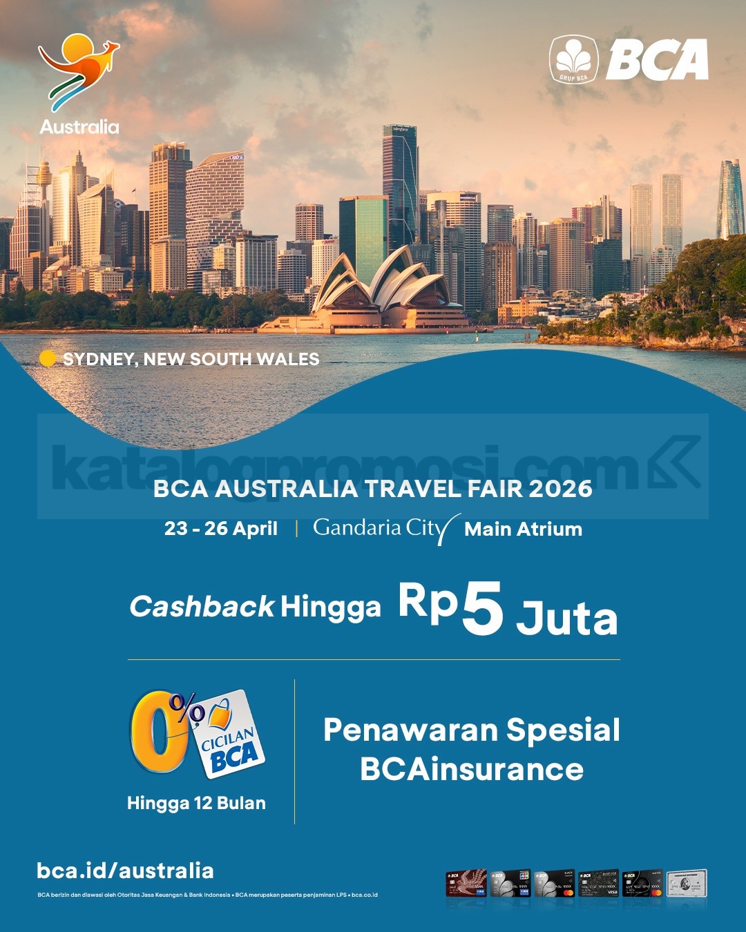 BCA Australia Travel Fair 2026 di Gandaria City mulai 23 β 26 April 2026 menghadirkan cashback hingga Rp5 juta, cicilan 0% hingga 12 bulan, dan penawaran BCAinsurance untuk pembelian produk perjalanan tujuan Australia.
