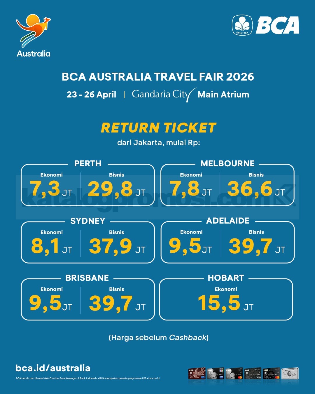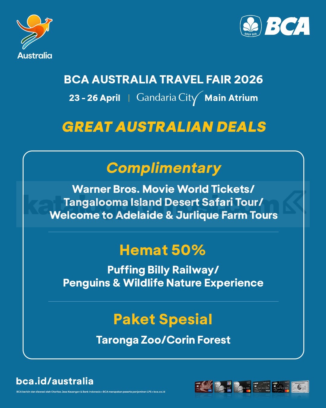- Berlaku bagi nasabah yang telah melakukan pembelian produk perjalanan tujuan Australia selama event BCA Australia Travel Fair 2026 di Gandaria City.