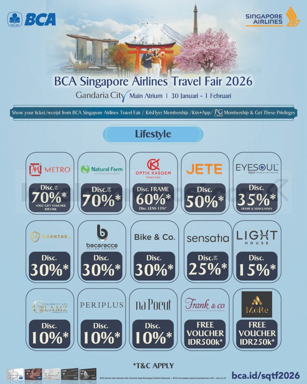 BCA Singapore Airlines Travel Fair 2026 di Gandaria City digelar 30 Januari β 1 Februari 2026 di Main Atrium dengan special fares, cashback, dan berbagai benefit kartu BCA.