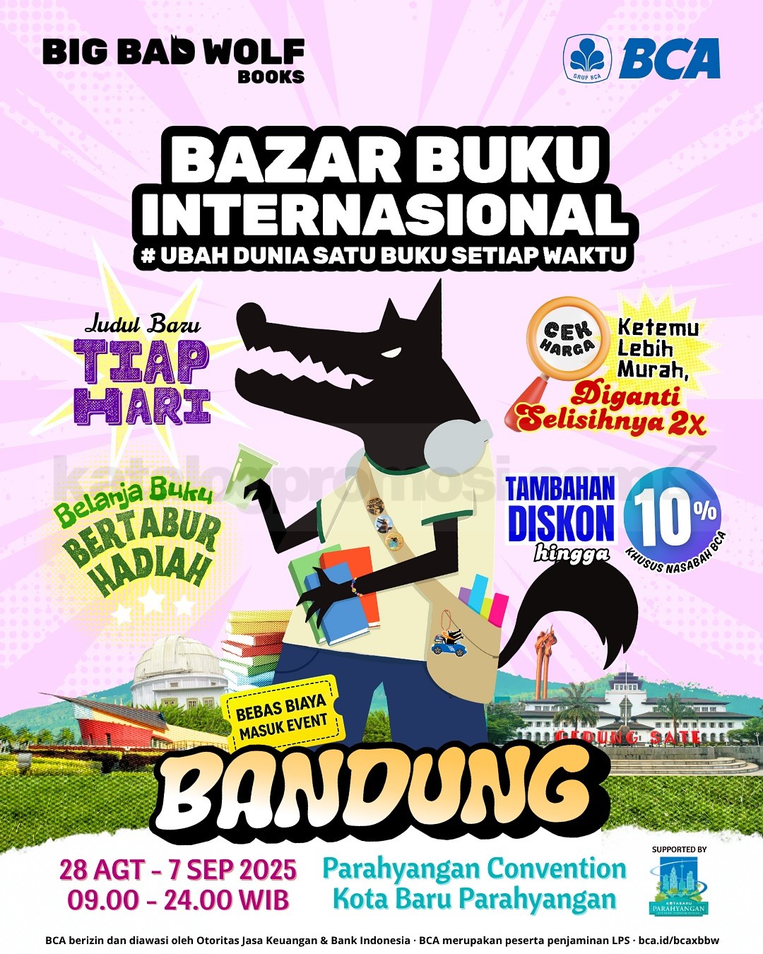 Wolfies Bandung, saatnya nikmati pengalaman tak terlupakan di Big Bad Wolf Tour 2025 Bandung. Lebih dari satu juta buku baru siap diburu sampai tengah malam di Parahyangan Convention, Kota Baru Parahyangan.