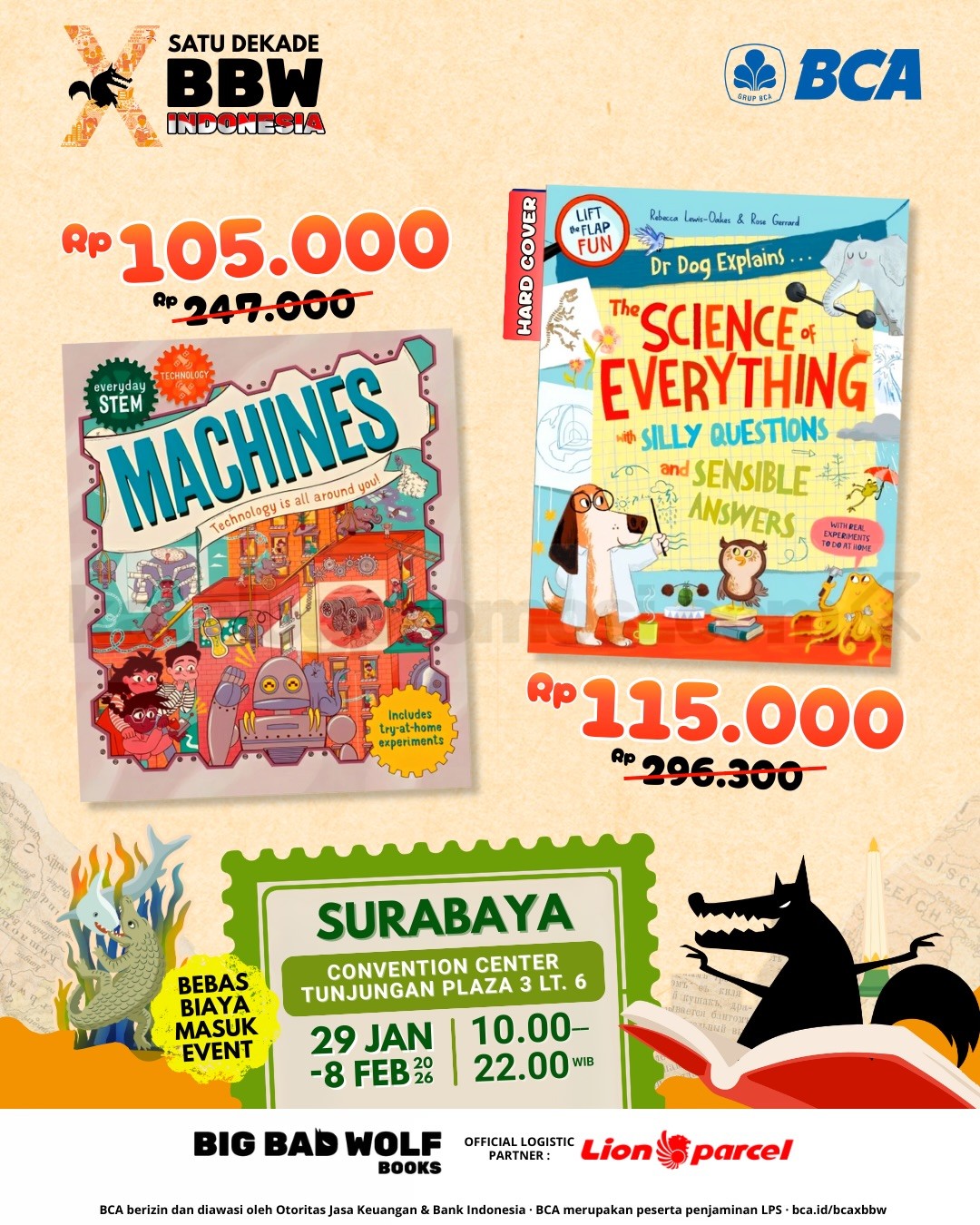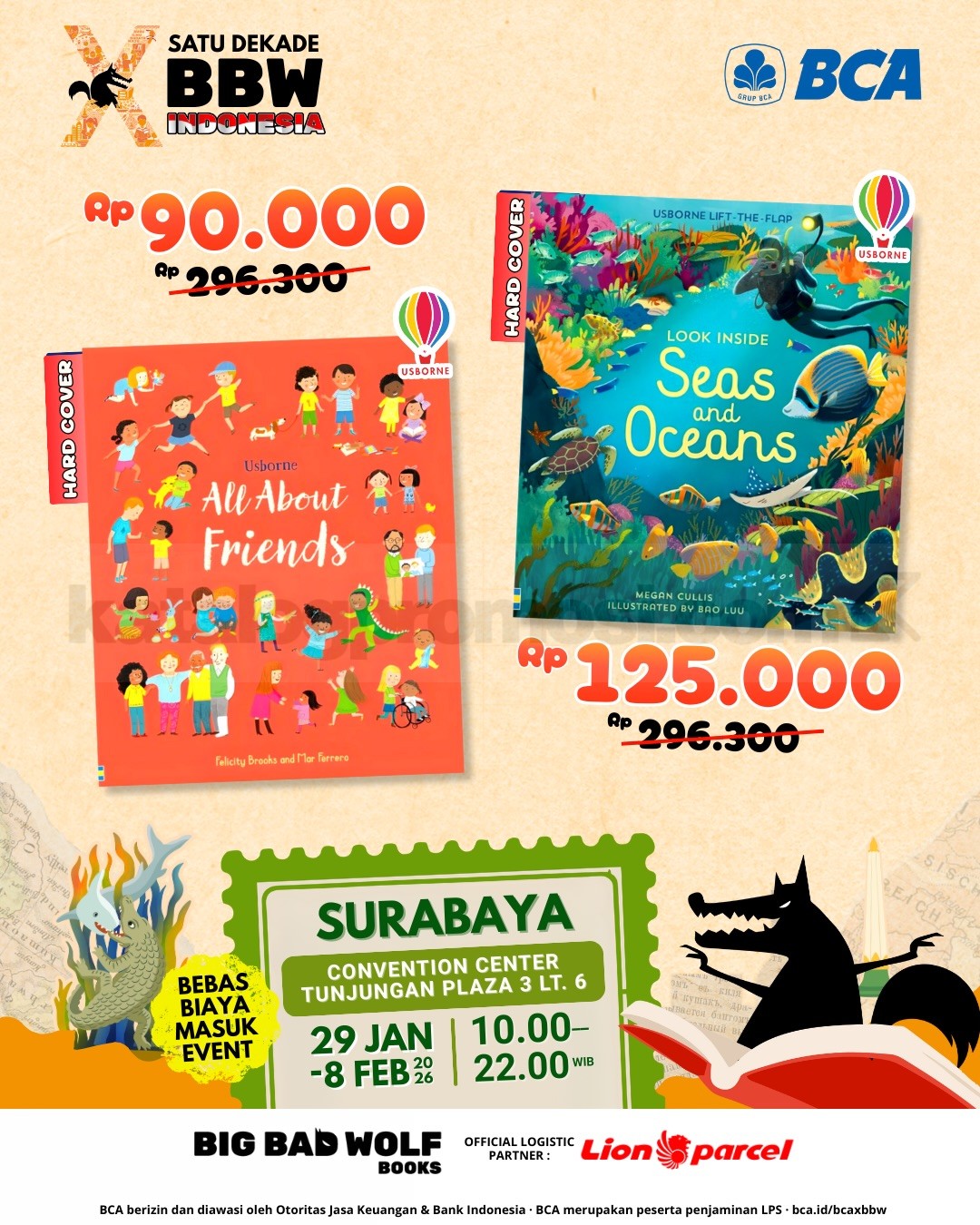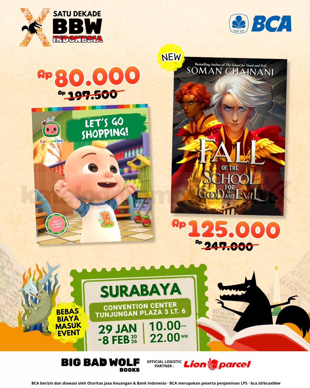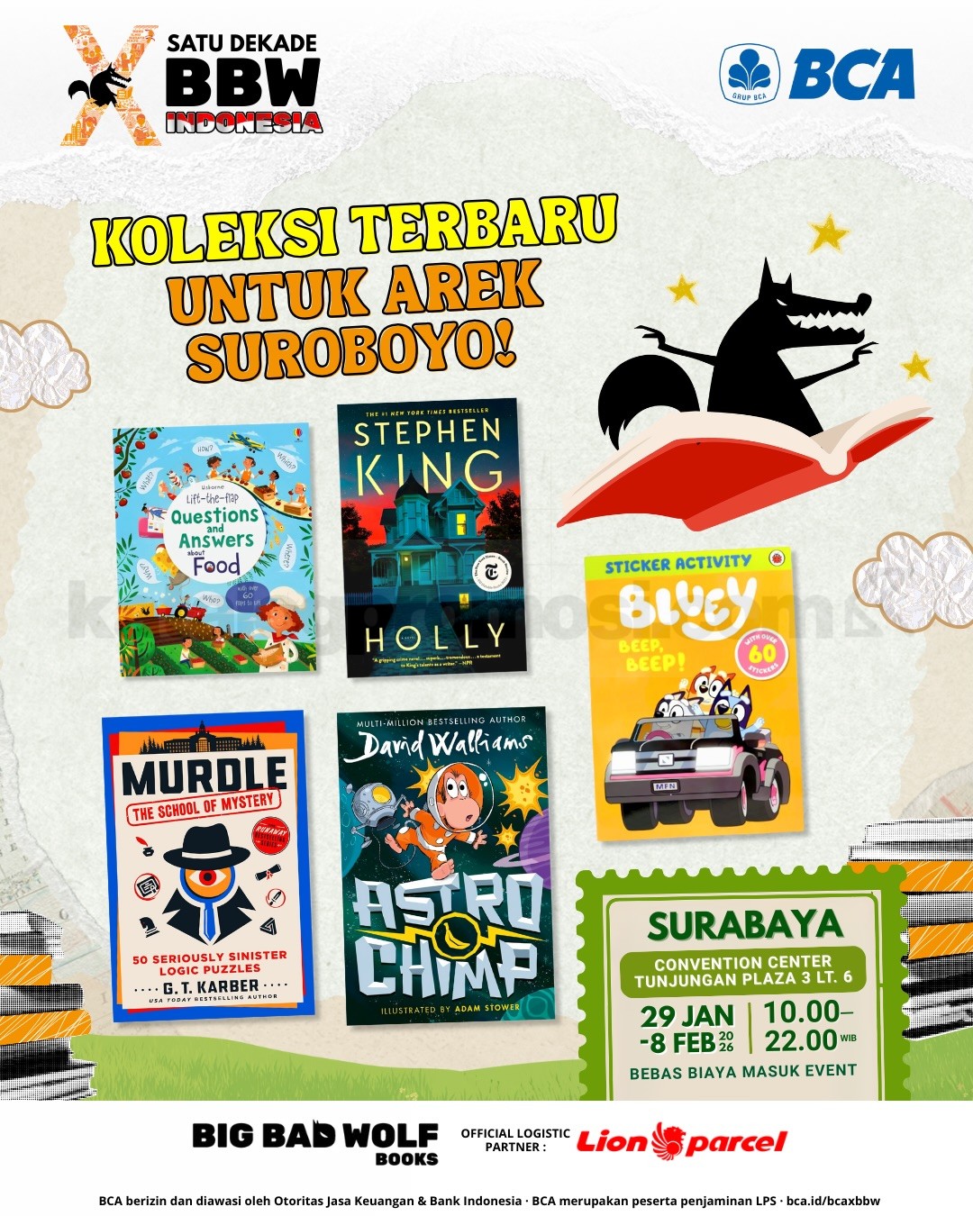 Big Bad Wolf Tour 2026 di Surabaya berlangsung 29 Januari – 8 Februari 2026 di Convention Center Tunjungan Plaza 3, gratis masuk dengan koleksi buku internasional terbaru.