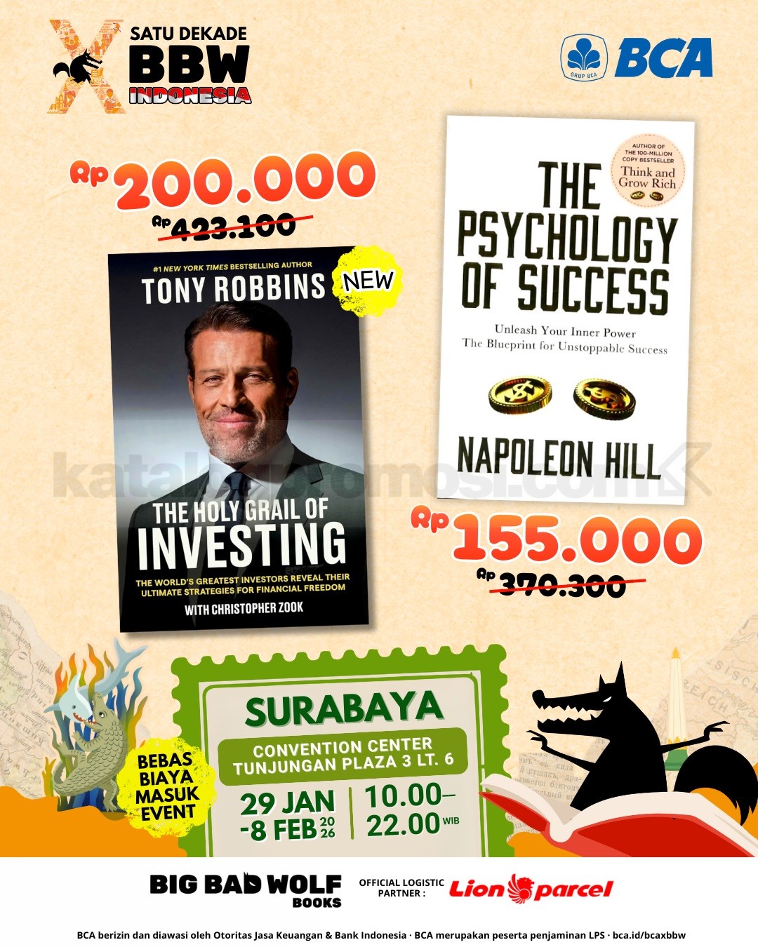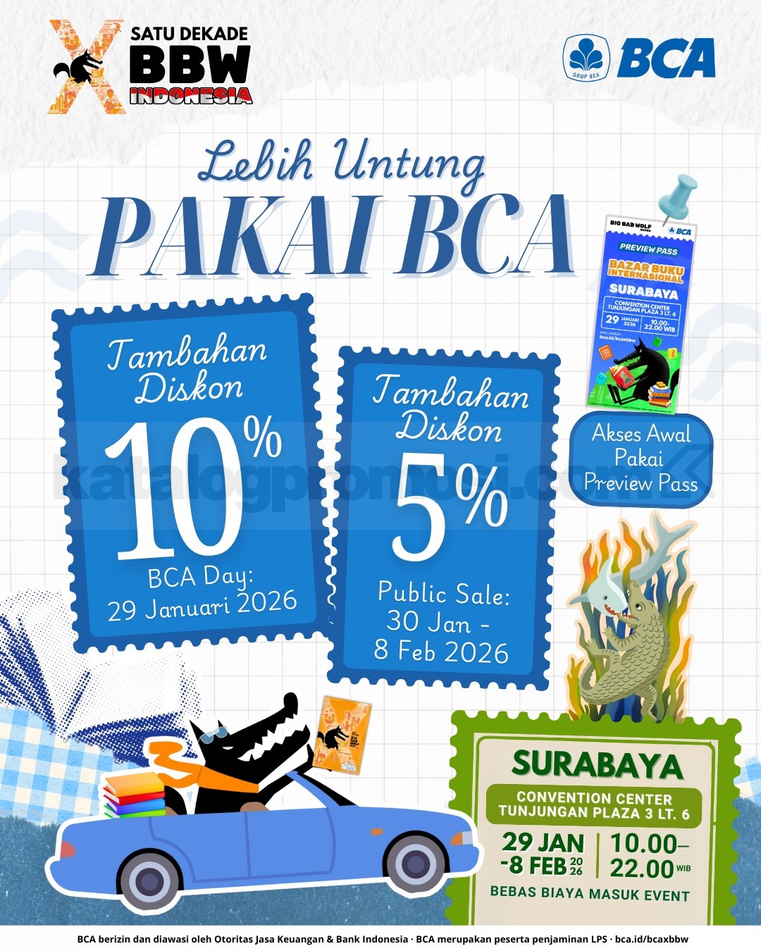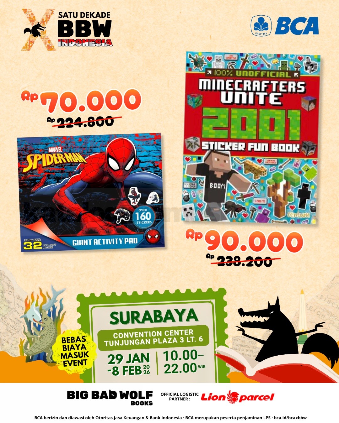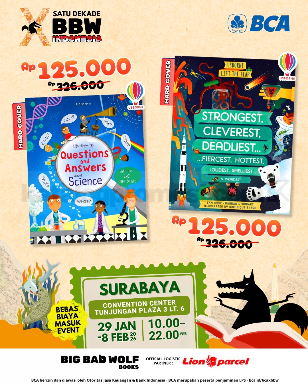 Big Bad Wolf Tour 2026 di Surabaya berlangsung 29 Januari – 8 Februari 2026 di Convention Center Tunjungan Plaza 3, gratis masuk dengan koleksi buku internasional terbaru.