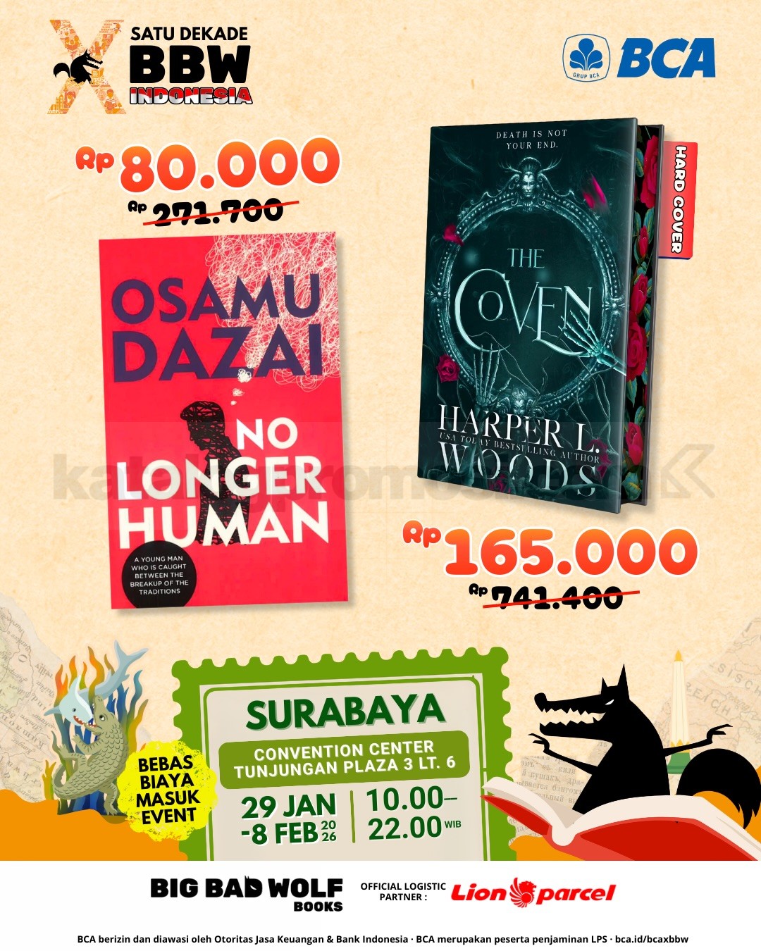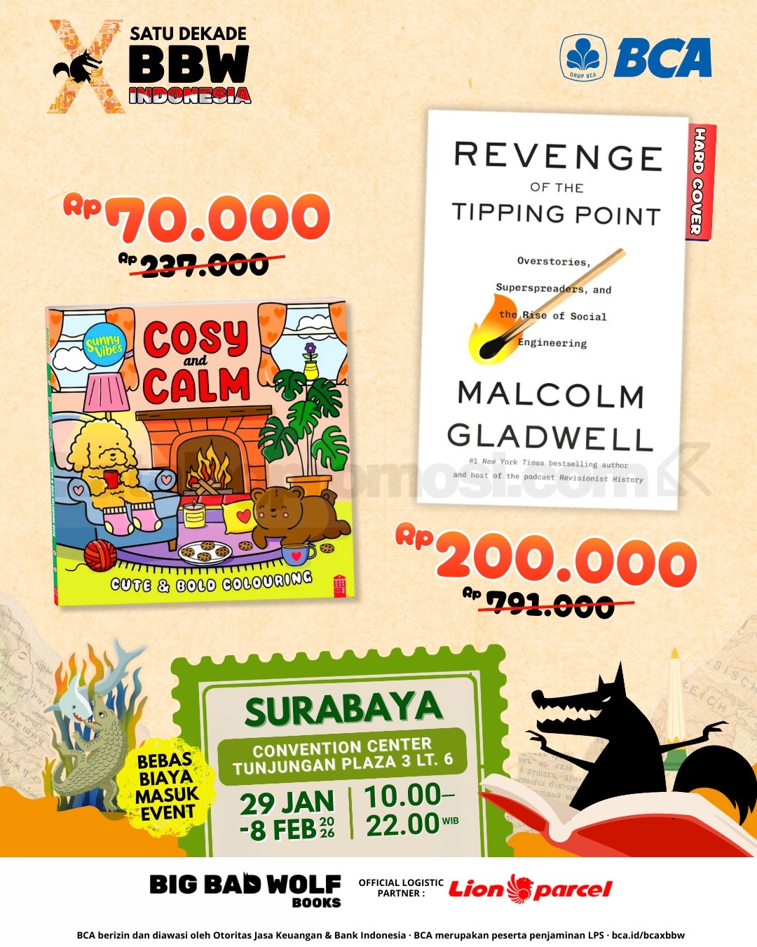 Dengan koleksi buku yang terus diperbarui dan durasi event yang panjang, Big Bad Wolf Tour 2026 Surabaya layak masuk agenda wajib buat pembaca di awal tahun. Datang lebih awal atau sempatkan mampir beberapa kali biar tidak kehabisan judul incaran.