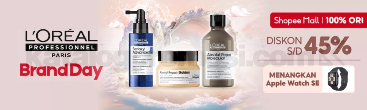 Jangan sampai kelewatan Brand Day L’Oréal Professionnel! Cuma dua hari buat dapetin diskon 45%, produk original, dan peluang menangin Apple Watch SE. Kunjungi shopee.co.id, cek promonya, dan belanja sekarang! 🎁