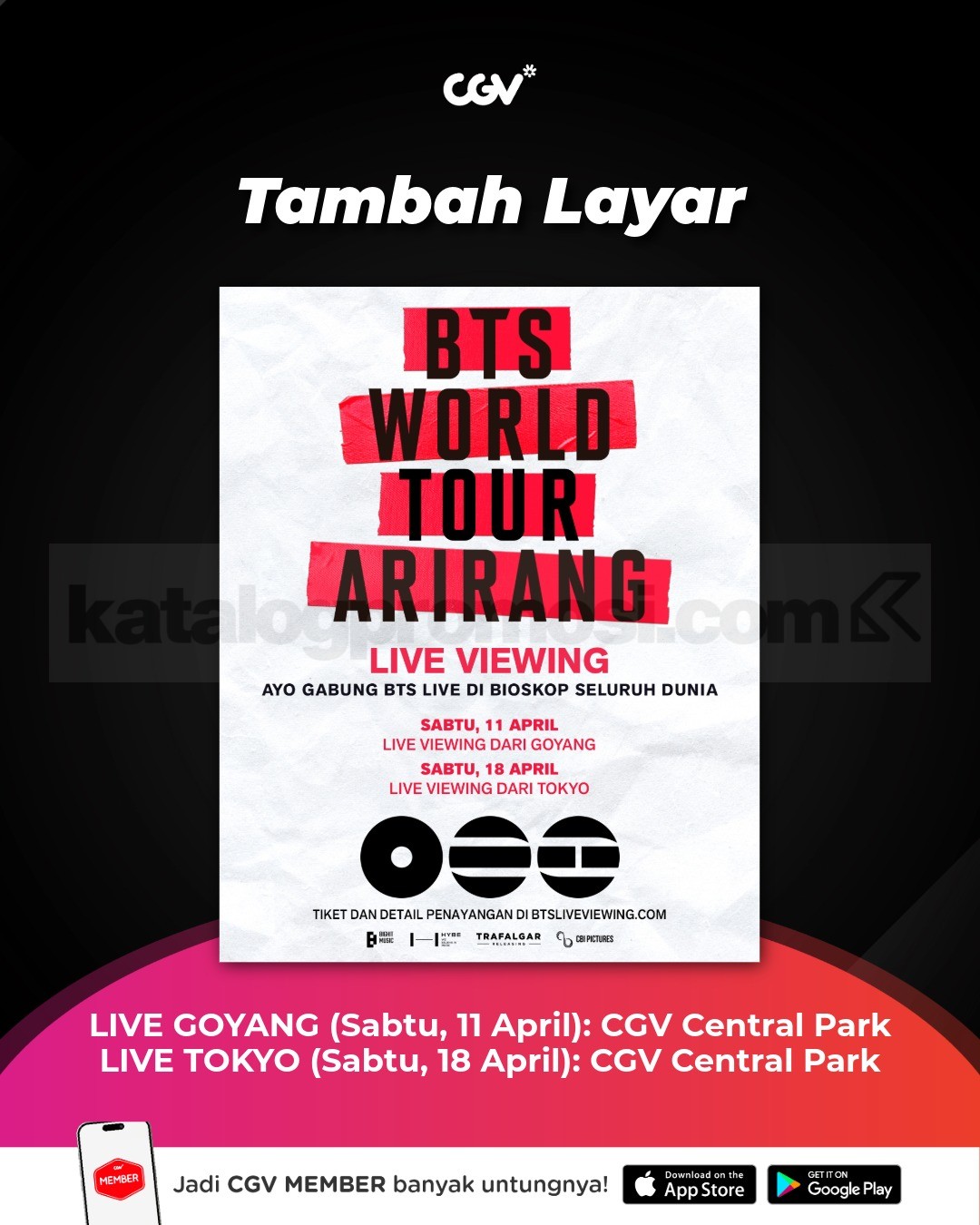 BTS World Tour Arirang Live Viewing di CGV Central Park mulai tanggal 11 April 2026 untuk konser Goyang dan Tokyo. Program ini dapat diakses melalui pembelian tiket di aplikasi atau web resmi CGV dengan penambahan layar khusus bagi para ARMY.