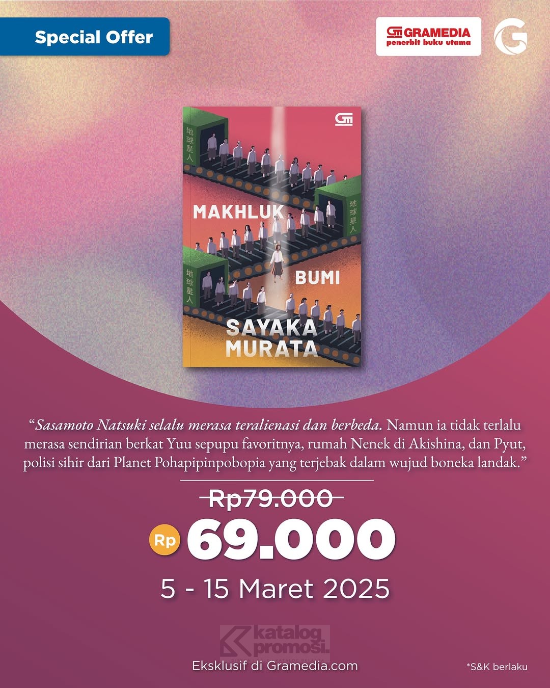 - Harga spesial Rp69 ribu setiap pembelian buku Makhluk Bumi karya Sayaka Murata (base price Rp79 ribu).