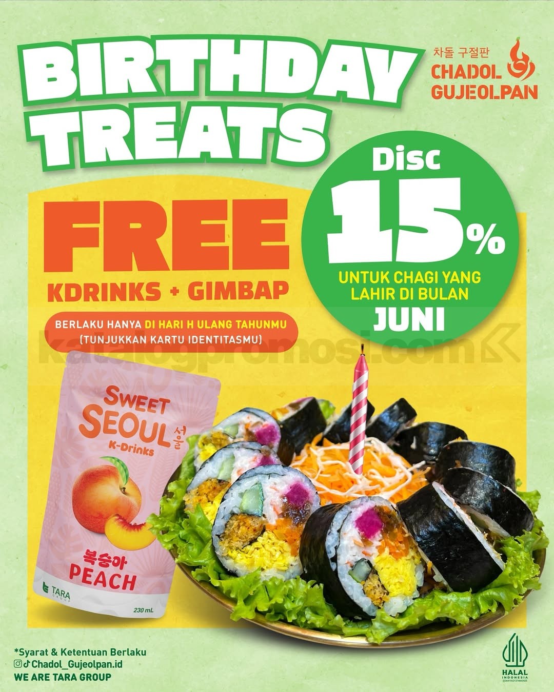 Nikmati Promo Birthday Treats Chadol Gujeolpan dengan berbagai hadiah spesial: diskon 15% untuk semua menu, GRATIS K-Drinks, hingga Gimbap Birthday Cake ππ. Rayakan momen spesialmu bersama teman atau keluarga sambil menikmati hidangan Korea favorit di Chadol Gujeolpan.