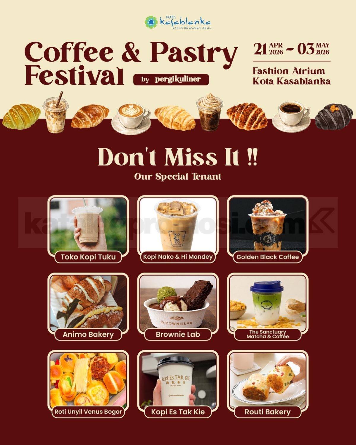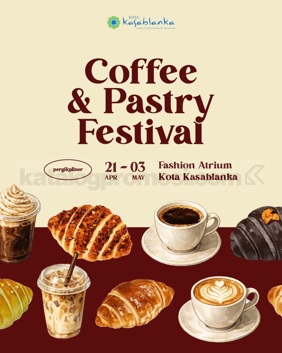 Coffee & Pastry Festival di Kota Kasablanka berlangsung setiap hari selama periode 21 April – 3 Mei 2026 pukul 10.00 – 22.00 WIB di Fashion Atrium Kota Kasablanka.