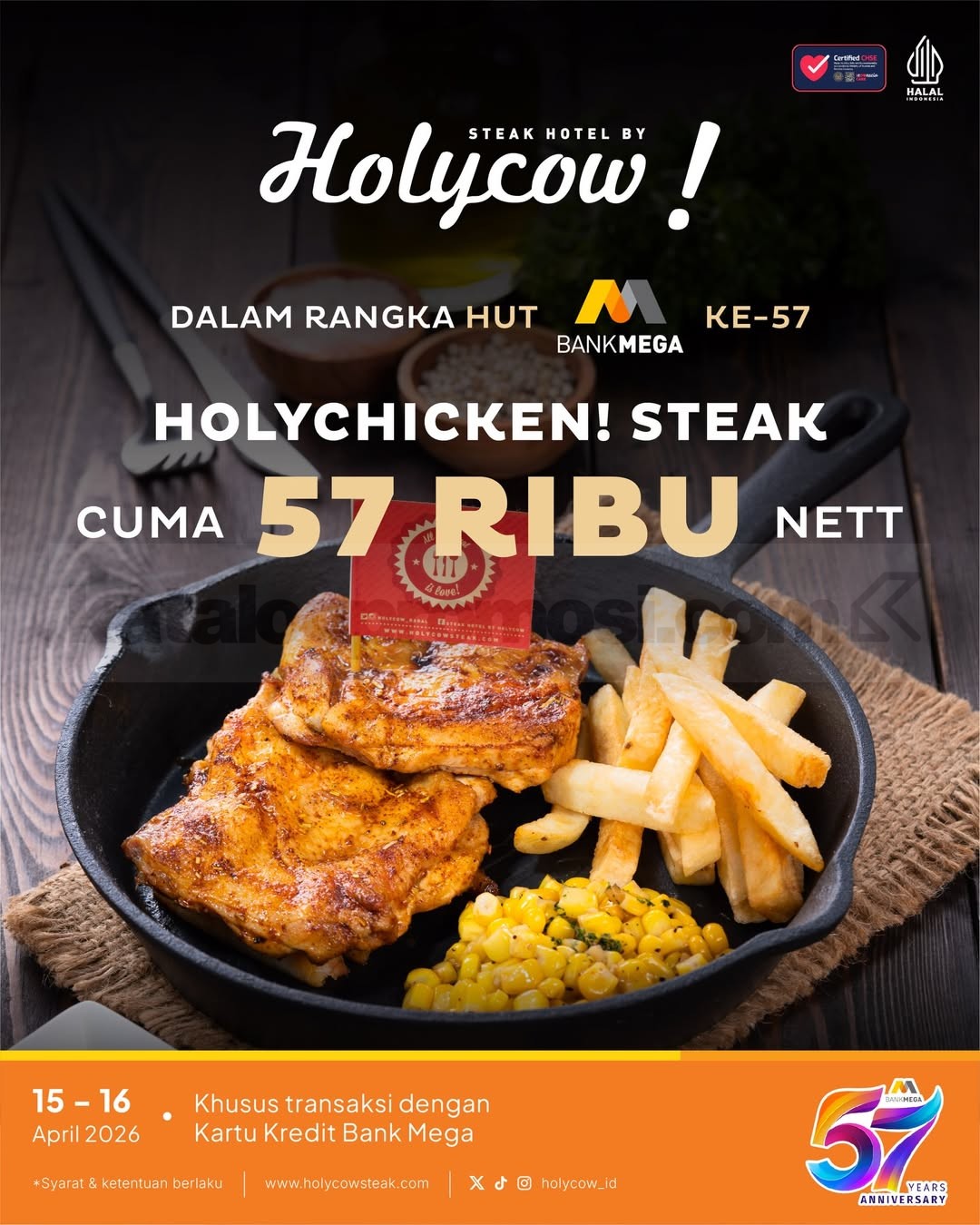Promo Holycow HUT Bank Mega Ke 57 Holychicken Steak cuma Rp. 57.000 nikmati chicken steak lengkap berlaku mulai tanggal 15 April 2026 – 16 April 2026 dengan kartu kredit Bank Mega