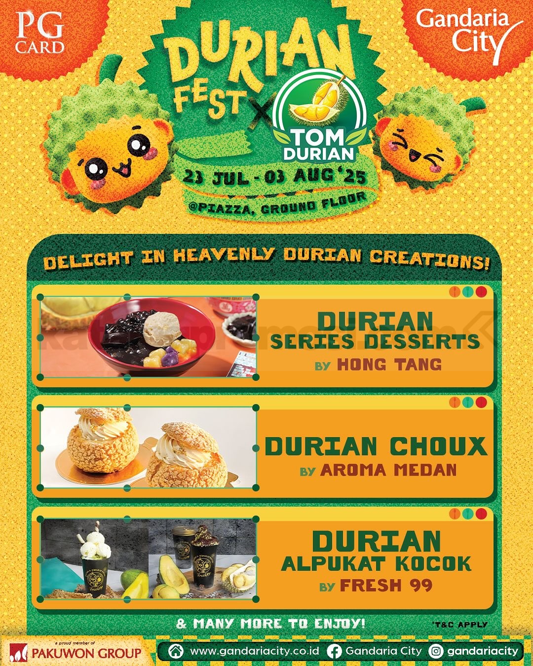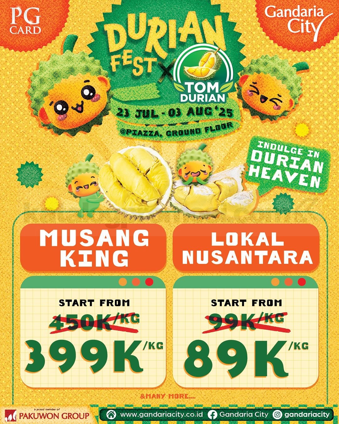 Durian Fest 2025 kembali ke Gandaria City! Hadiri festival durian terlezat bareng Tom Durian mulai 23 Juli β 3 Agustus 2025 di Piazza, Ground Floor