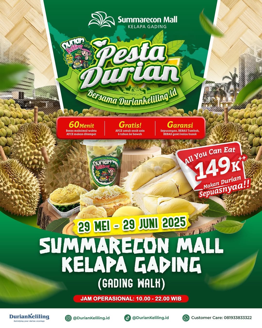 Pecinta durian mana suaranya? 🗣️ Mulai 29 Mei – 29 Juni 2025, saatnya manjain lidah di Summarecon Mall Kelapa Gading, ada pesta durian bersama duriankeliling.id. Ada banyak paket enak, harga hemat, dan pastinya bikin kamu balik lagi! 🤤