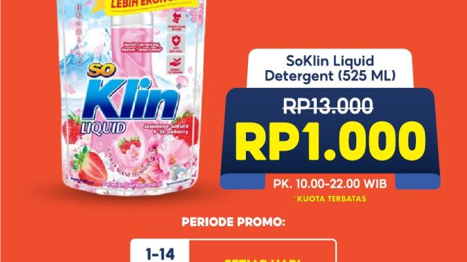 Promo Alfamart ShopeePay 9.9 Festival Serba Murah SoKlin 525ml cuma Rp1.000 berlaku 1 – 14 September 2025 jam 10.00 – 22.00 WIB di lokasi tertentu.