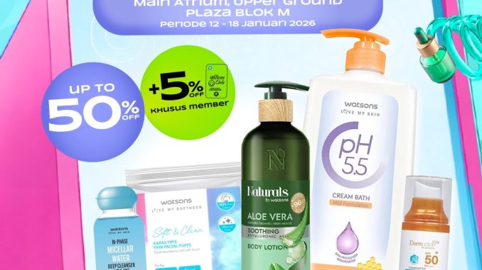 Promo Watsons Beauty Bazaar Watsons Brand diskon hingga 50% + 5% untuk member, beli face wash, body care & skincare berlaku 12 – 18 Januari 2026 di Plaza Blok M.