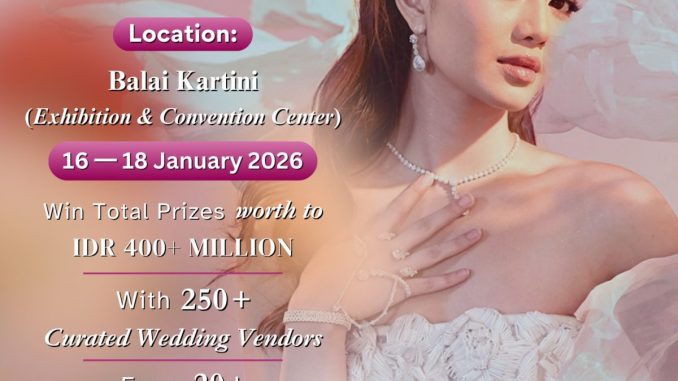 WeddingMarket Fair 2026 di Balai Kartini berlangsung 16 – 18 Januari 2026 dengan 250+ vendor pernikahan, promo menarik, test food, dan grand prize spektakuler.
