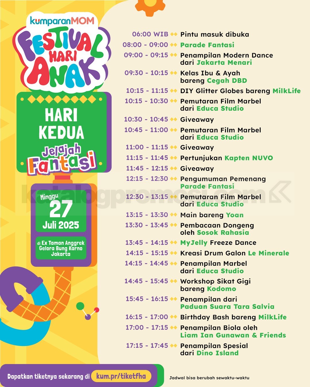 Festival Hari Anak 2025 siap digelar! Ikuti keseruannya di Ex Taman Anggrek GBK pada 26–27 Juli 2025. Registrasi gratis bisa dilakukan melalui kum.pr/tiketfha sebelum ke lokasi.