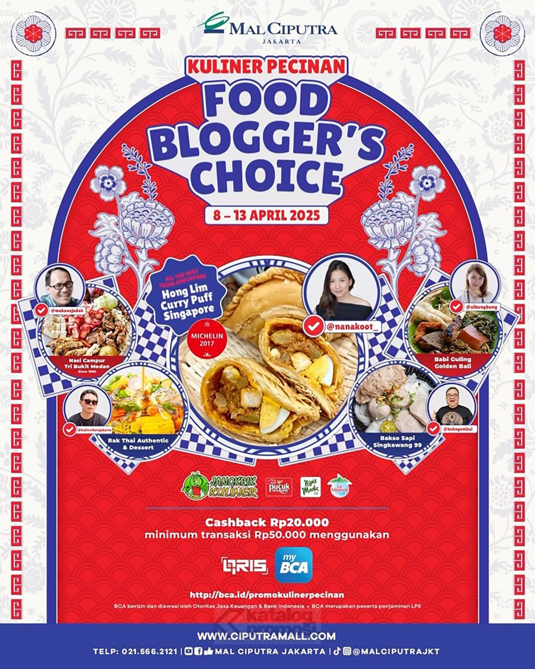Festival Kuliner Pecinan Food Blogger’s Choice di Mal Ciputra Jakarta, 8–13 April 2025. Ada cashback QRIS BCA Rp. 20.000 & tenant halal/non-halal.