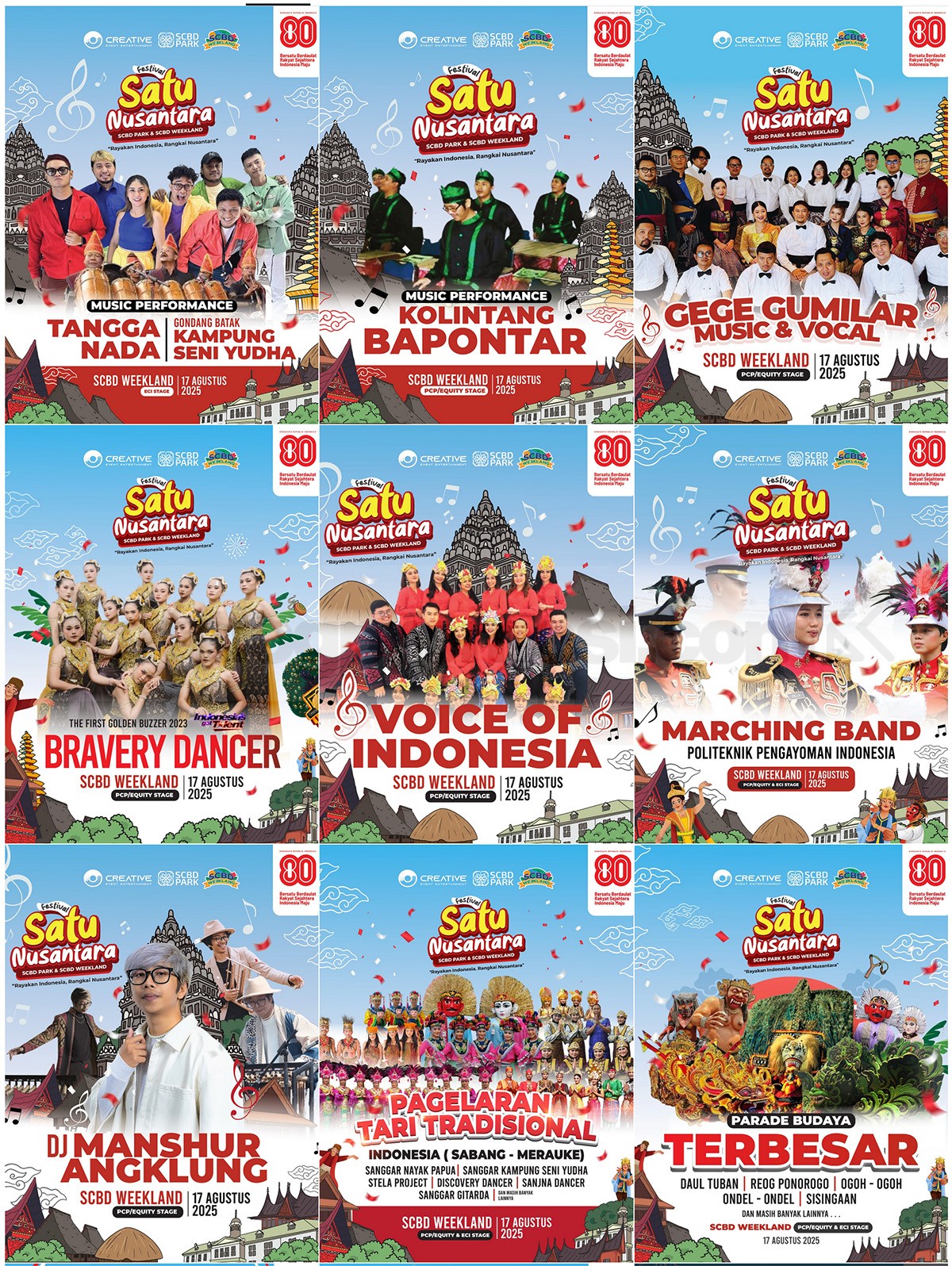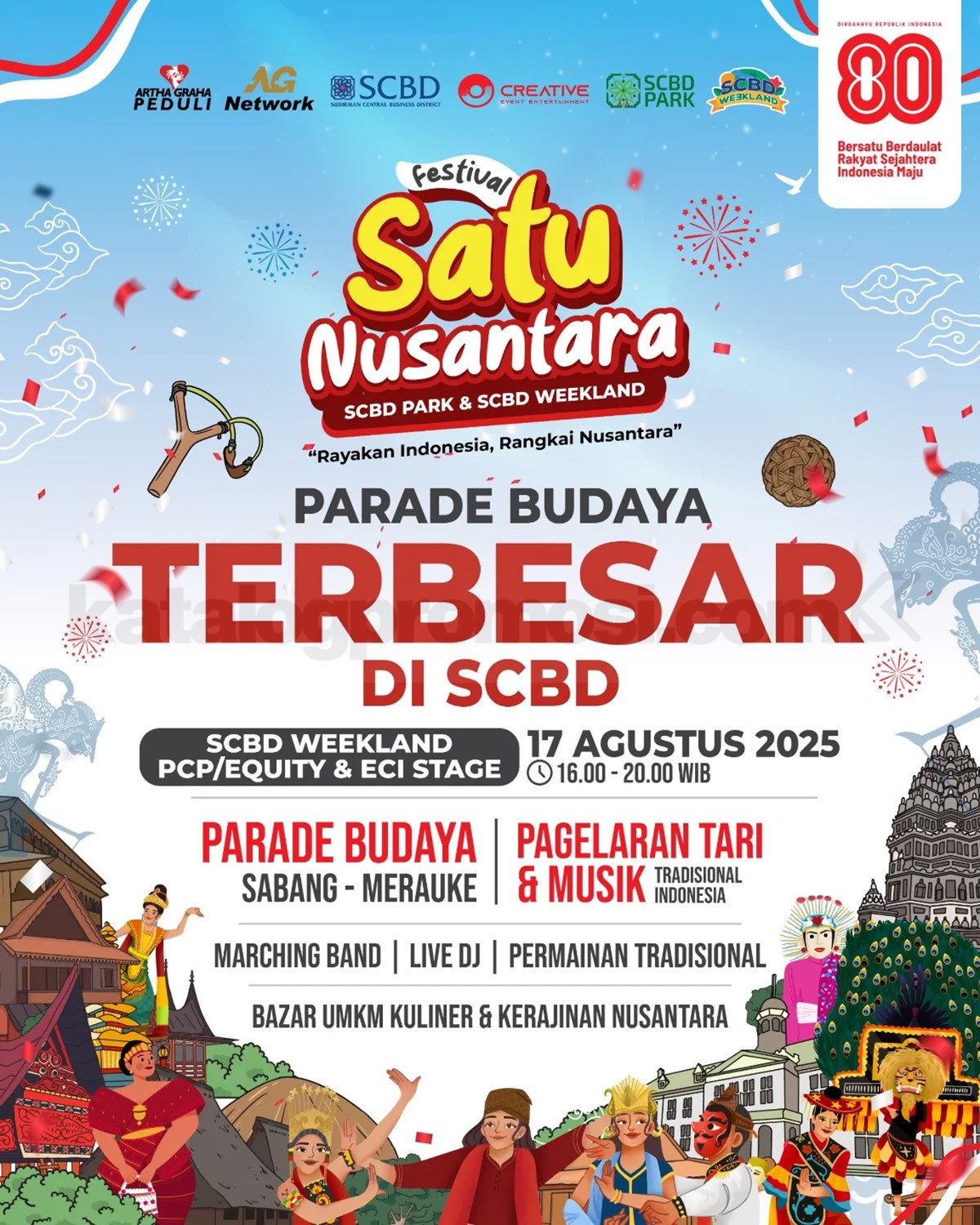 Festival Satu Nusantara di SCBD menghadirkan parade budaya terbesar, tari, musik, bazar kuliner, dan hiburan seru, berlaku mulai tanggal 17 Agustus 2025 di SCBD Weekland.