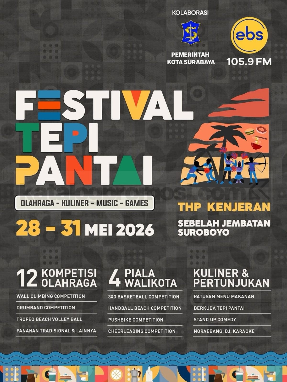 Festival Tepi Pantai di THP Kenjeran berlangsung 28 – 31 Mei 2026 menghadirkan kompetisi olahraga, kuliner, music, dan games di area sebelah Jembatan Suroboyo Surabaya.