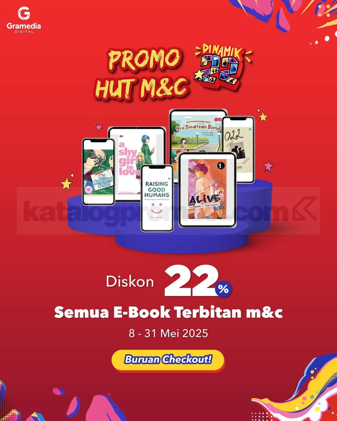 🎉 Lagi HUT M&C ke-22 nih, dan pastinya nggak lengkap tanpa tebar diskon gede-gedean! Buat kamu yang doyan komik, dongeng, dan e-book kece, ini saatnya borong hemat. 🎁