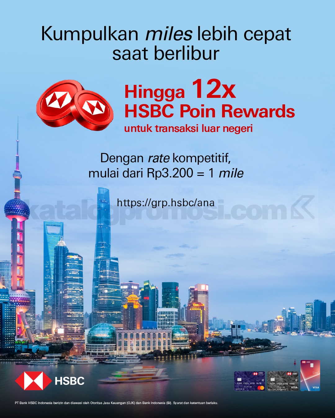 • Bonus hingga 12x HSBC Poin Rewards untuk transaksi luar negeri, dengan akumulasi mulai Rp3.200 untuk mendapatkan 1 mile