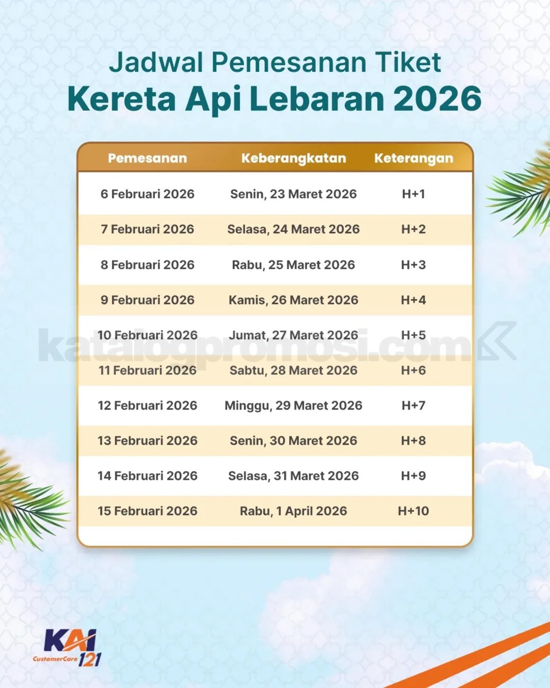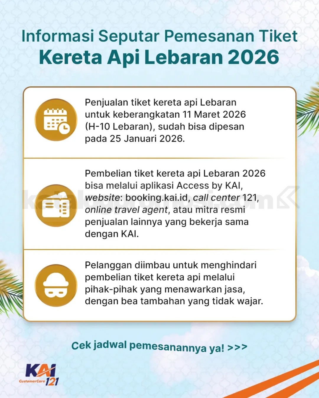 Pemesanan tiket kereta api mudik Lebaran 2026 dimulai pada 25 Januari 2026 untuk keberangkatan H-10 Lebaran. Setelah itu, penjualan dilakukan bertahap setiap hari mengikuti tanggal keberangkatan sampai periode arus balik H+10.