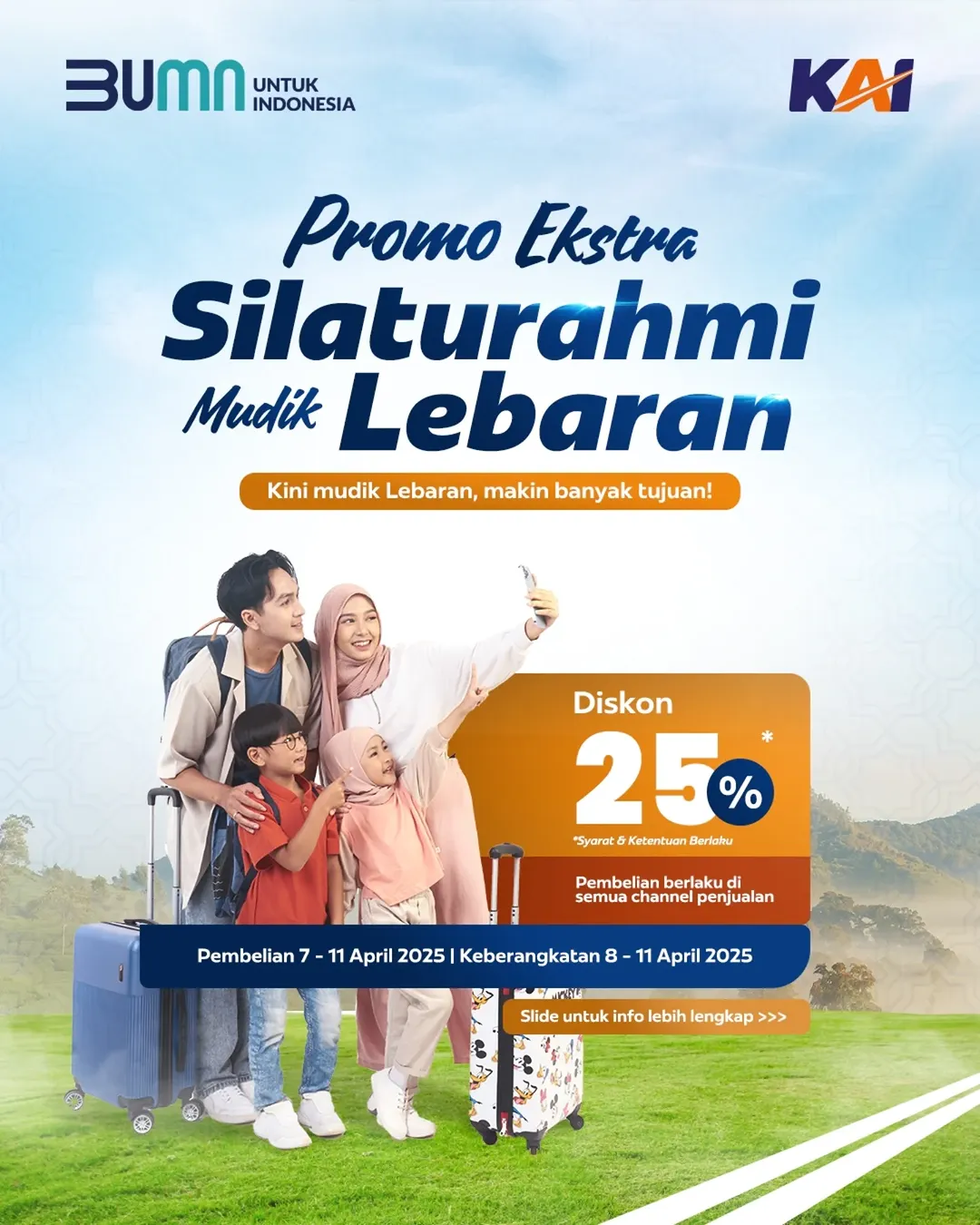 KAI Promo Ekstra Silaturahmi Mudik Lebaran Diskon 25%. Berlaku hingga 11 April 2025.