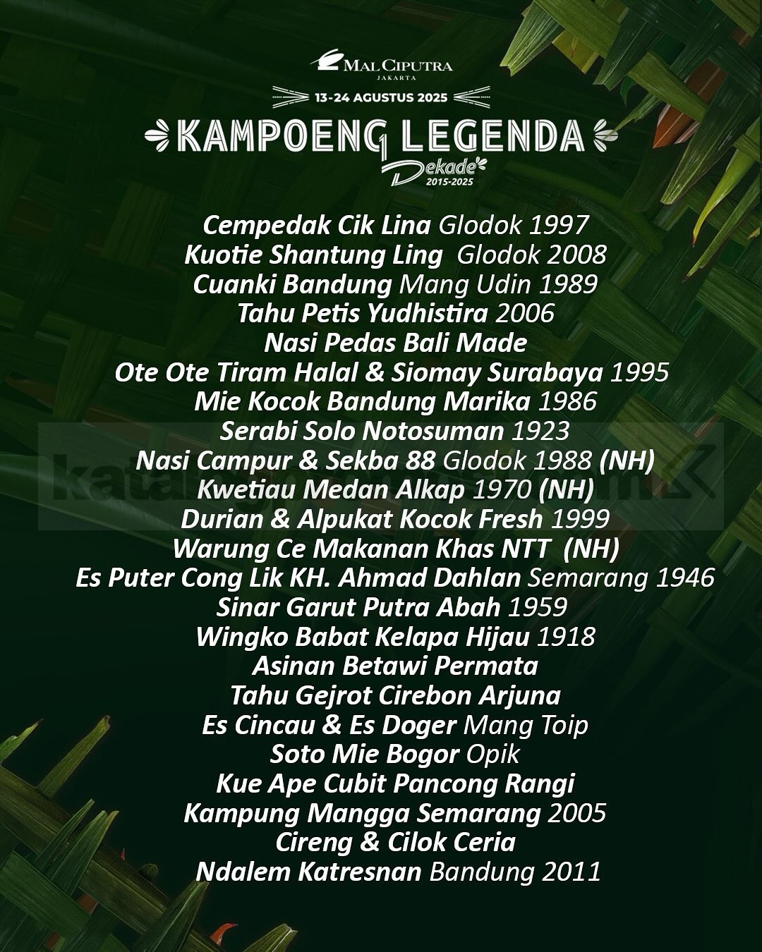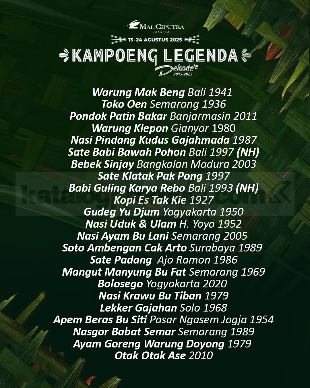 Kampoeng Legenda 1 Dekade di Mal Ciputra Jakarta berlangsung mulai tanggal 13โ24 Agustus 2025 dengan kuliner legendaris dari berbagai daerah.