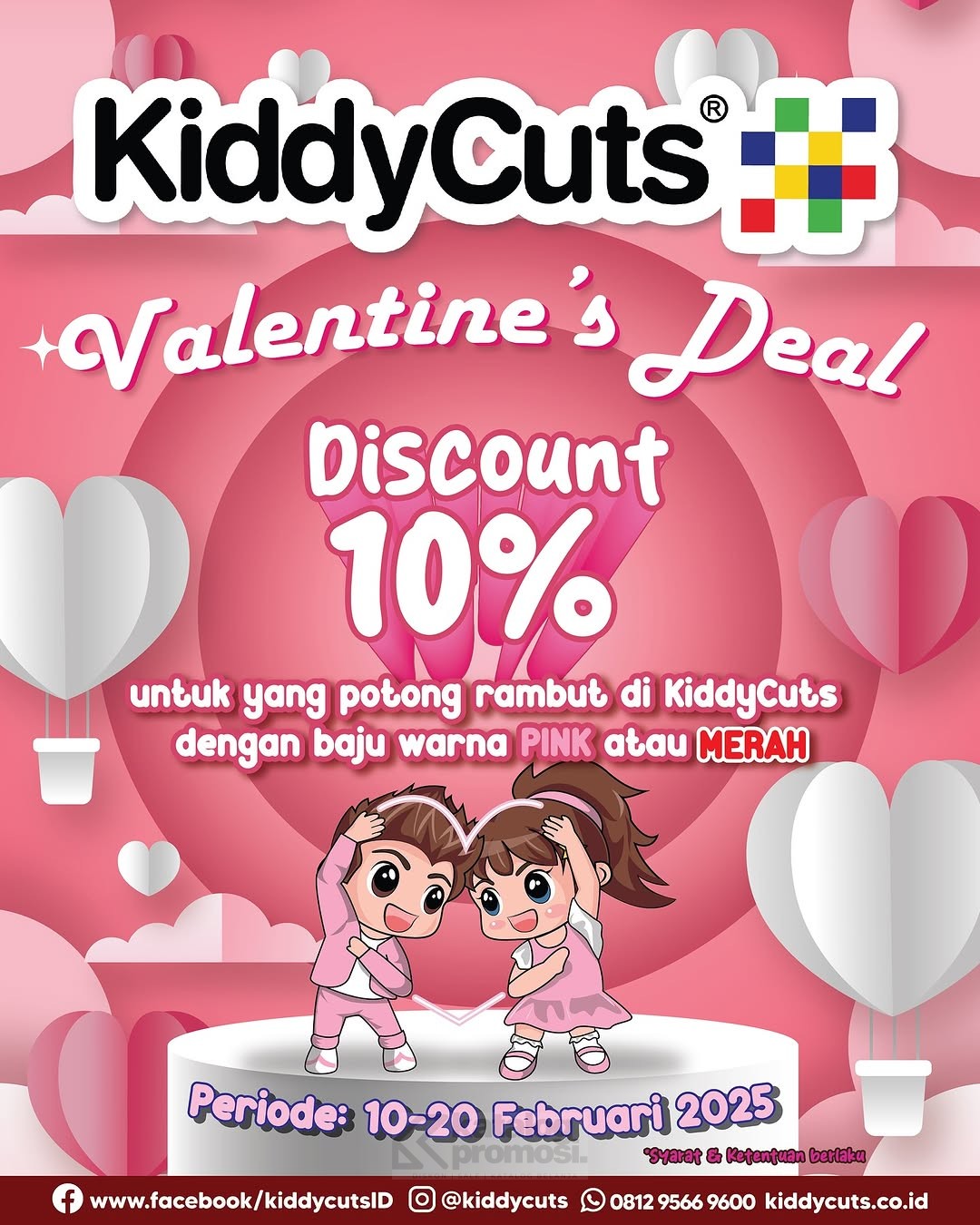 Valentine’s day hampir tiba! Yuk, ajak si kecil tampil lebih fresh dan menggemaskan dengan KiddyCuts Valentine’s Deal. Ada diskon 10% khusus untuk anak yang datang mengenakan baju warna pink atau merah. ✨
