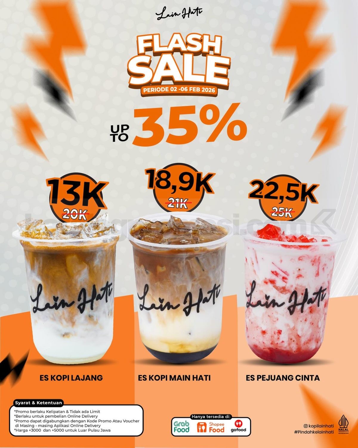 Promo Kopi Lain Hati Flash Sale Diskon hingga 35% mulai Rp. 13.000 untuk menu favorit via GoFood, GrabFood, dan ShopeeFood, berlaku 2-6 Februari 2026 di lokasi tertentu.