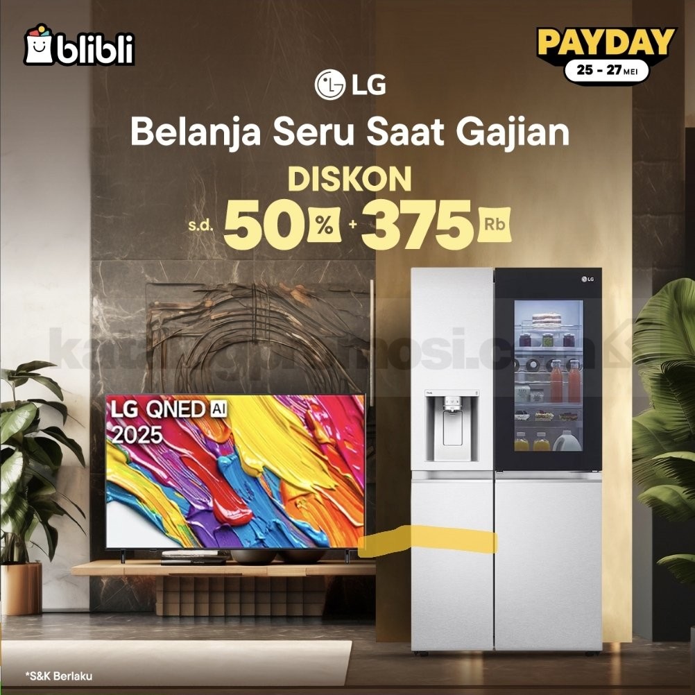 Gajian udah masuk? Waktunya borong barang impian di Blibli Payday! π Ada diskon LG hingga 50% buat kamu yang lagi cari TV, kulkas, mesin cuci, dan produk kece lainnya dari LG. Nggak cuma itu, masih ditambah ekstra diskon Rp375 ribu yang bikin belanja makin hemat. πΈ