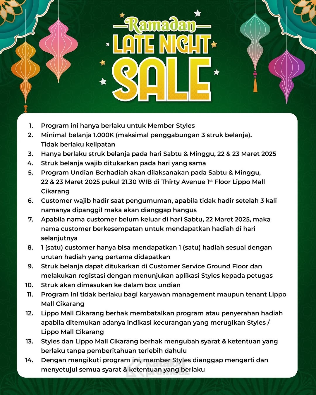 Lippo Mall Cikarang Ramadhan Late Night Sale! Diskon hingga 80% + undian hadiah logam mulia, TV, kulkas. Berlaku 22-23 Maret 2025!