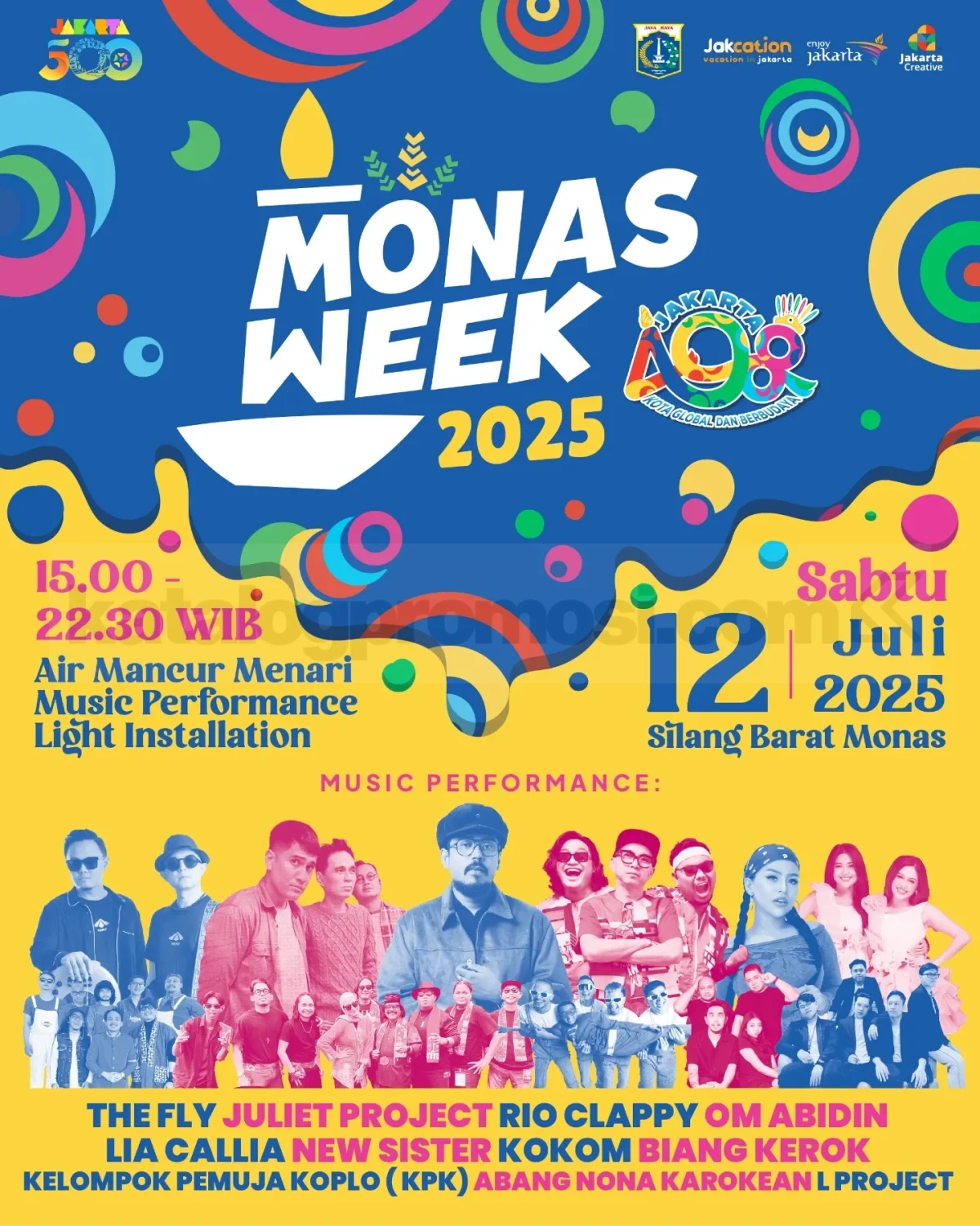 Monas Week 2025 di Silang Barat Monas hanya di tanggal 12 Juli! Saksikan air mancur menari, musik dari THE FLY hingga KPK, dan instalasi cahaya keren. Gratis!