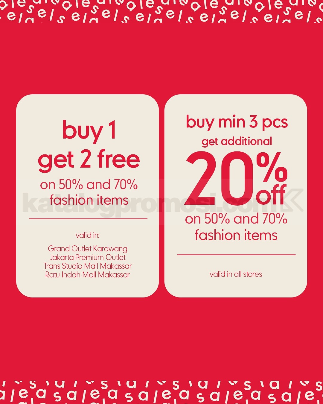 - Promo Buy 1 Get 2 Free hanya dapat digunakan di Grand Outlet Karawang, Jakarta Premium Outlet, Trans Studio Mall Makassar, dan Ratu Indah Mall Makassar.
