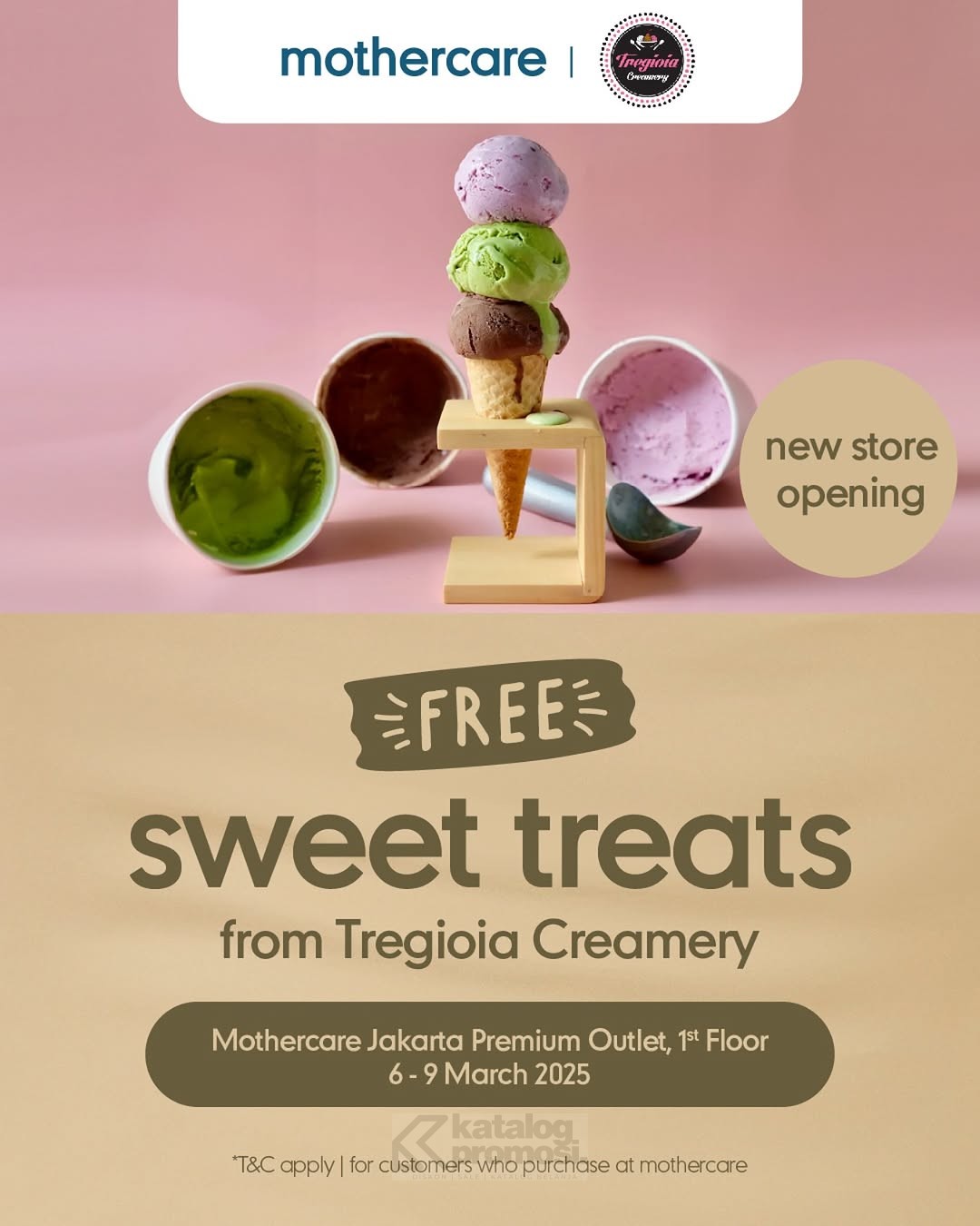 Mothercare resmi buka store baru di Alam Sutera! Untuk merayakannya, ada kejutan manis buat kamu. Belanja minimal Rp250.000 di Mothercare Jakarta Premium Outlets dan langsung dapetin gelato gratis dari Tregioia Creamery. Caranya gampang: