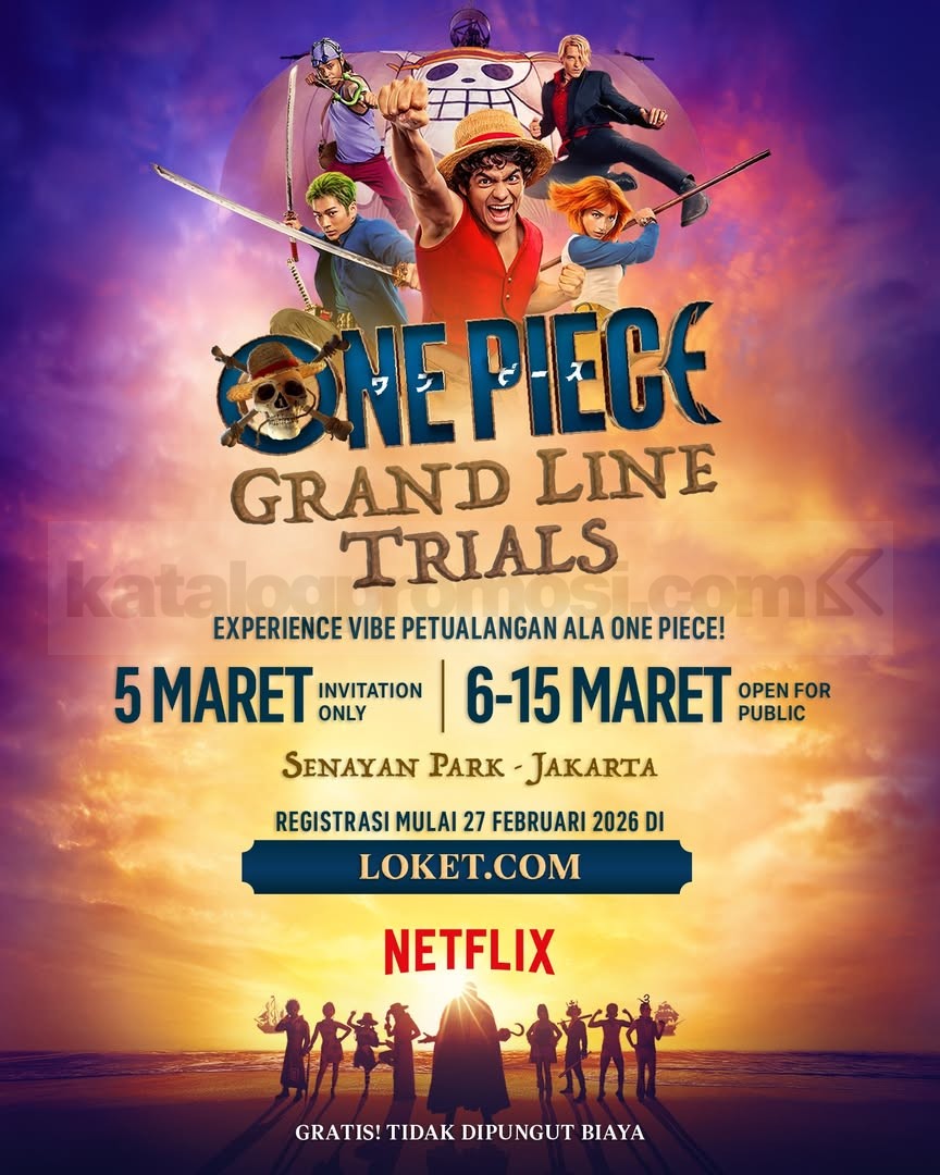 One Piece Grand Line Trials di Senayan Park Jakarta berlangsung 5 Maret 2026 invitation only dan 6 – 15 Maret 2026 open for public. Registrasi mulai 27 Februari 2026 melalui Loket.com, akses GRATIS tanpa biaya masuk, usia minimal 16 tahun.