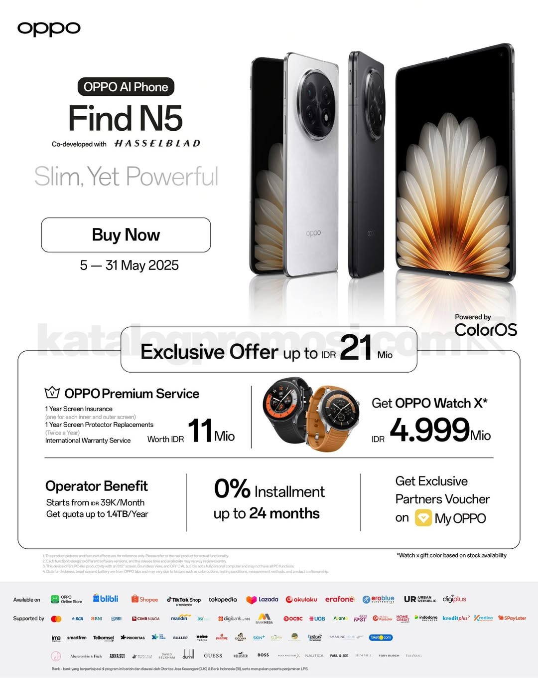 Yang bikin makin menarik, sekarang kamu bisa dapetin OPPO Find N5 lewat promo super spesial! Nikmati penawaran eksklusif hingga IDR 21 juta (termasuk hadiah OPPO Watch X senilai IDR 4.999 juta). 🎁🔥