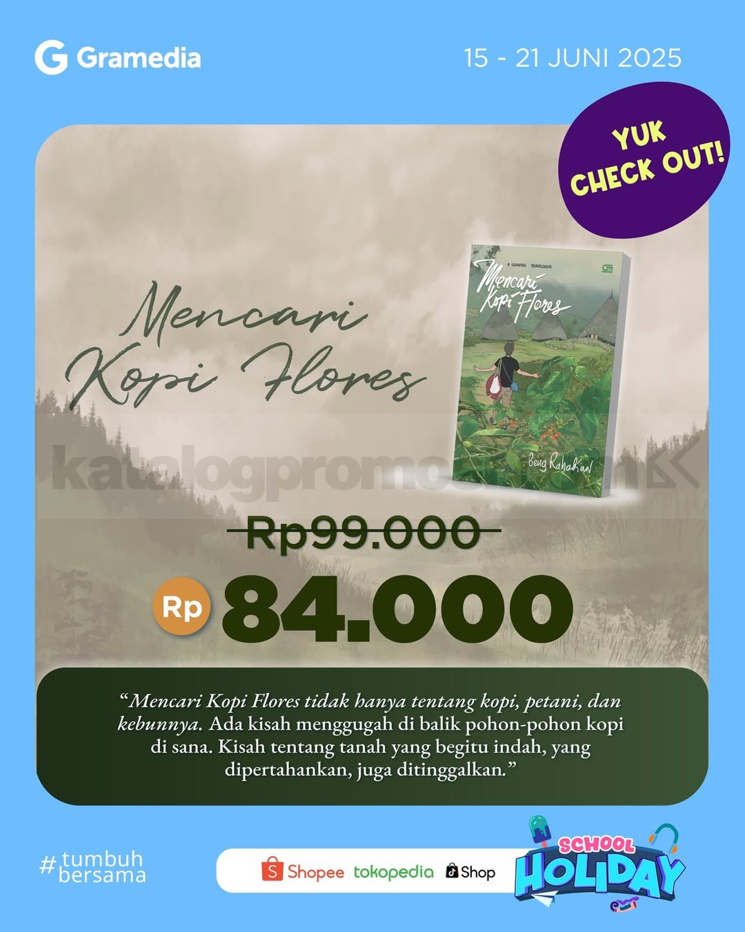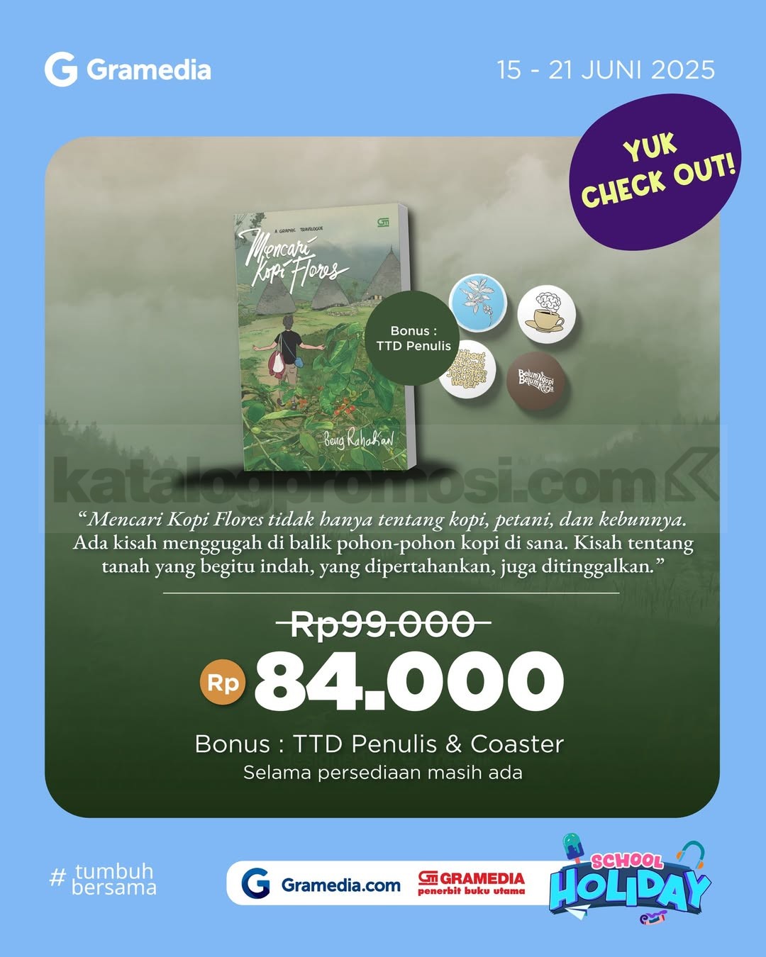 Buat kamu yang doyan ngopi sambil baca, atau yang penasaran sama kisah di balik secangkir kopi Nusantara ☕️📚 — sekarang saatnya kamu grab kesempatan spesial ini! Lagi ada promo pre-order “Mencari Kopi Flores” di website Gramedia dan marketplace favorit kamu.