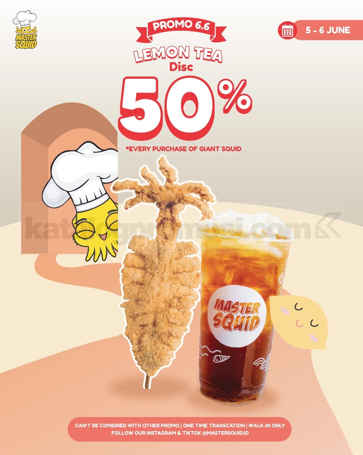 Promo Master Squid Skewer Diskon 50% Setiap pembelian Giant Squid, Berlaku selama bulan November 2025