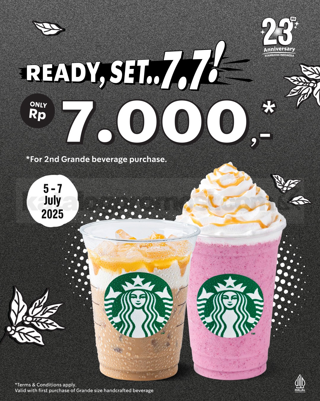 Jangan sampai kelewatan Promo 7.7 Starbucks, beli 2 minuman handcrafted ukuran Grande, minuman kedua cuma Rp7.000, berlaku 5-7 Juli 2025 di seluruh Starbucks Indonesia!