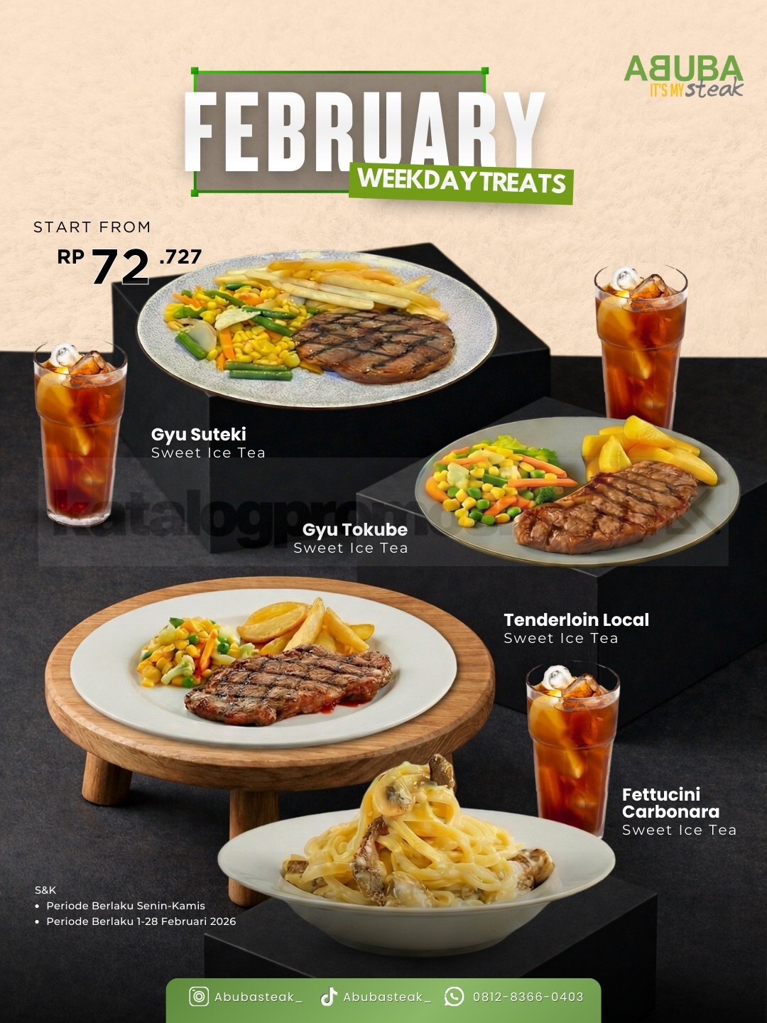Promo ABUBA February Weekday Treats mulai Rp. 72.727 berlaku di seluruh outlet ABUBA Itβs My Steak dan hanya tersedia di hari kerja, jadi cocok buat kamu yang pengin makan enak tanpa keluar biaya berlebih.