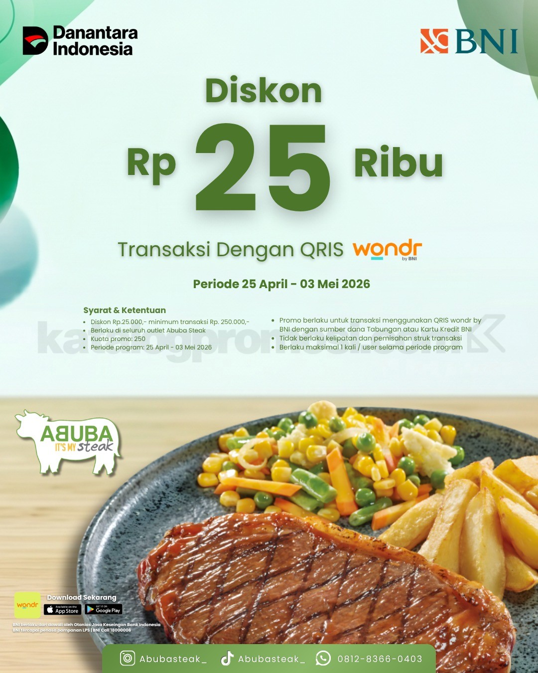 Promo Abuba Steak Diskon Rp. 25.000 Pakai QRIS Wondr BNI hemat min Rp. 250.000 bayar QRIS wondr BNI berlaku 25 April 2026 – 03 Mei 2026 di seluruh outlet.