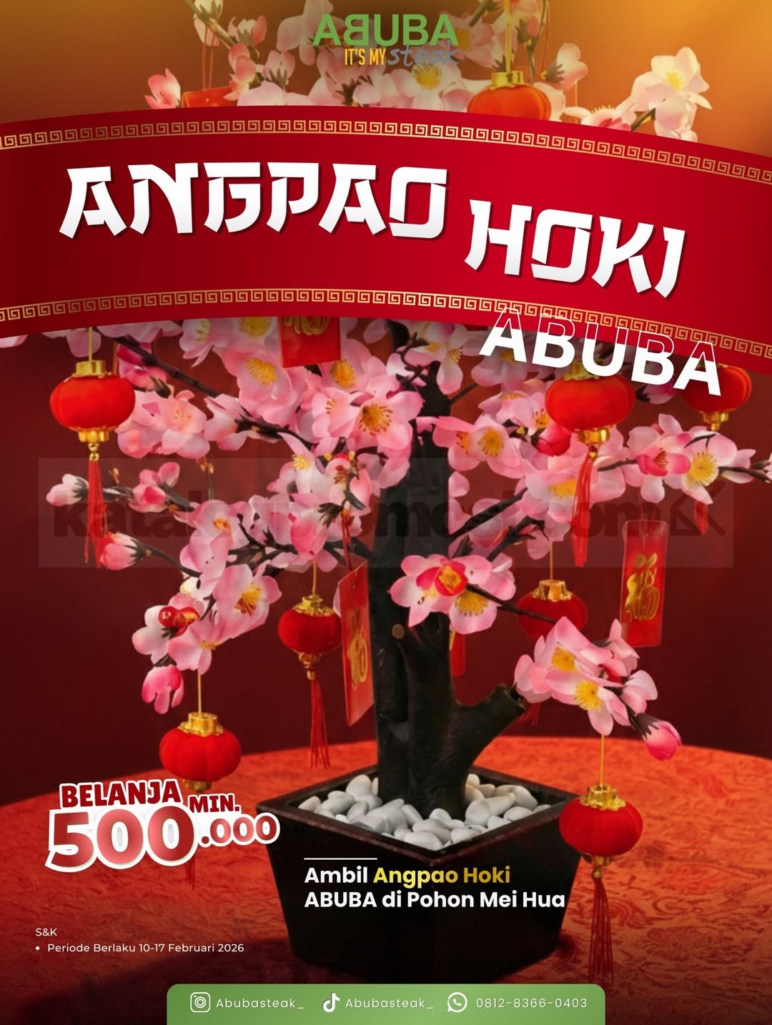 Promo Abuba Steak Gratis Angpao Hoki, dapat 1 angpao keberuntungan tiap transaksi min Rp. 500.000 berlaku mulai tanggal 10 Februari 2026 – 17 Februari 2026 di seluruh outlet
