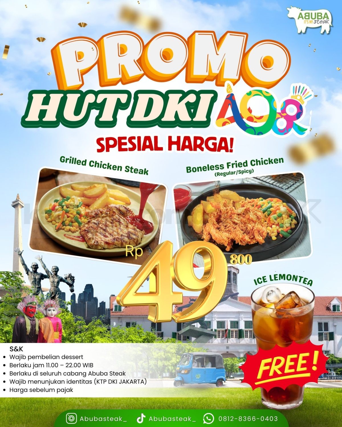 Rayain HUT Jakarta ke-498 bareng promo spesial dari Abuba Steak — cuma Rp49.800 buat menu lengkap, cukup tunjukkan KTP DKI Jakarta dan beli 1 dessert favorit kamu 🍰🍗