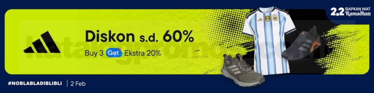 Promo Adidas Blibli 2.2 Siapkan Niat Ramadhan diskon hingga 60% plus ekstra diskon 20% beli 3 item berlaku tanggal 2 Februari 2026.