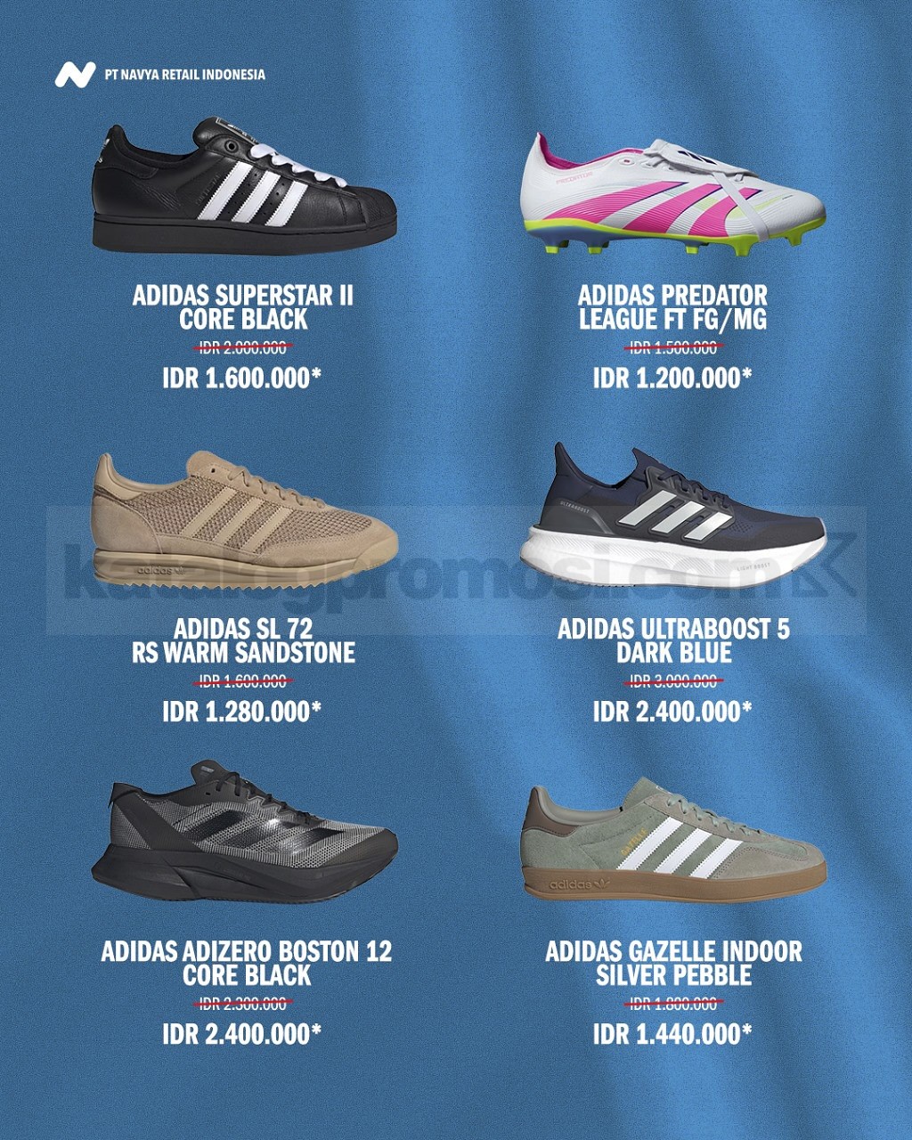 Promo ini berlangsung 26–30 September 2025 di seluruh Adidas store by Navya Retail Indonesia, berlaku untuk produk pilihan. Jangan tunggu lama, serbu store terdekat dan manfaatkan diskonnya sekarang juga! 👟⚡
